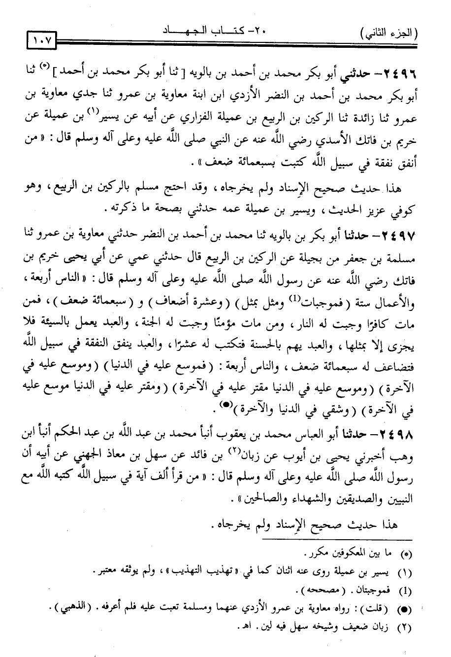 2497 - حَدَّثَنِي بِصِحَّةِ مَا ذَكَرتَهُ أَبُو بَكْرِ بْنُ بَالَوَيْهِ ، نا مُحَمَّدُ بْنُ أَحْمَدَ بْنِ النَّضْرِ ، حَدَّثَنِي مُعَاوِيَةُ بْنُ عَمْرٍو ، نا مَسْلَمَةُ بْنُ جَعْفَرٍ ، مِنْ بَجِيلَةَ ، عَنِ الرُّكَيْنِ بْنِ الرَّبِيعِ ، قَالَ: حَدَّثَنِي عَمِّي ، عَنْ أَبِي يَحْيَى خُرَيْمِ بْنِ فَاتِكٍ رَضِيَ اللَّهُ عَنْهُ ، عَنْ رَسُولِ اللَّهِ صَلَّى اللَّهُ عَلَيْهِ وَسَلَّمَ قَالَ: " النَّاسُ أَرْبَعَةٌ ، وَالْأَعْمَالُ سِتَّةٌ ، فَمُوجِبَاتٌ وَمِثْلٌ بِمِثْلٍ ، وَعَشَرَةُ أَضْعَافٍ ، وَسَبْعُ مِائَةِ ضِعْفٍ ، فَمَنْ مَاتَ كَافِرًا وَجَبَتْ لَهُ النَّارُ ، وَمَنْ مَاتَ مُؤْمِنًا وَجَبَتْ لَهُ الْجَنَّةُ ، وَالْعَبْدُ يَعْمَلُ بِالسَّيِّئَةِ فَلَا يُجْزَى إِلَّا بِمِثْلِهَا ، وَالْعَبْدُ يَهِمُّ بِالْحَسَنَةِ فَتُكْتَبُ لَهُ عَشْرًا ، وَالْعَبْدُ يُنْفِقُ النَّفَقَةَ فِي سَبِيلِ اللَّهِ فَتُضَاعَفُ لَهُ سَبْعَ مِائَةِ ضِعْفٍ ، وَالنَّاسُ أَرْبَعَةٌ ، فَمُوَسَّعٌ عَلَيْهِ فِي الدُّنْيَا ، وَمُوَسَّعٌ عَلَيْهِ فِي الْآخِرَةِ ، وَمُوَسَّعٌ عَلَيْهِ فِي الدُّنْيَا مُقَتَّرٌ عَلَيْهِ فِي الْآخِرَةِ ، وَمُقَتَّرٌ عَلَيْهِ فِي الدُّنْيَا مُوَسَّعٌ عَلَيْهِ فِي الْآخِرَةِ ، وَشَقِيٌّ فِي الدُّنْيَا وَالْآخِرَةِ "