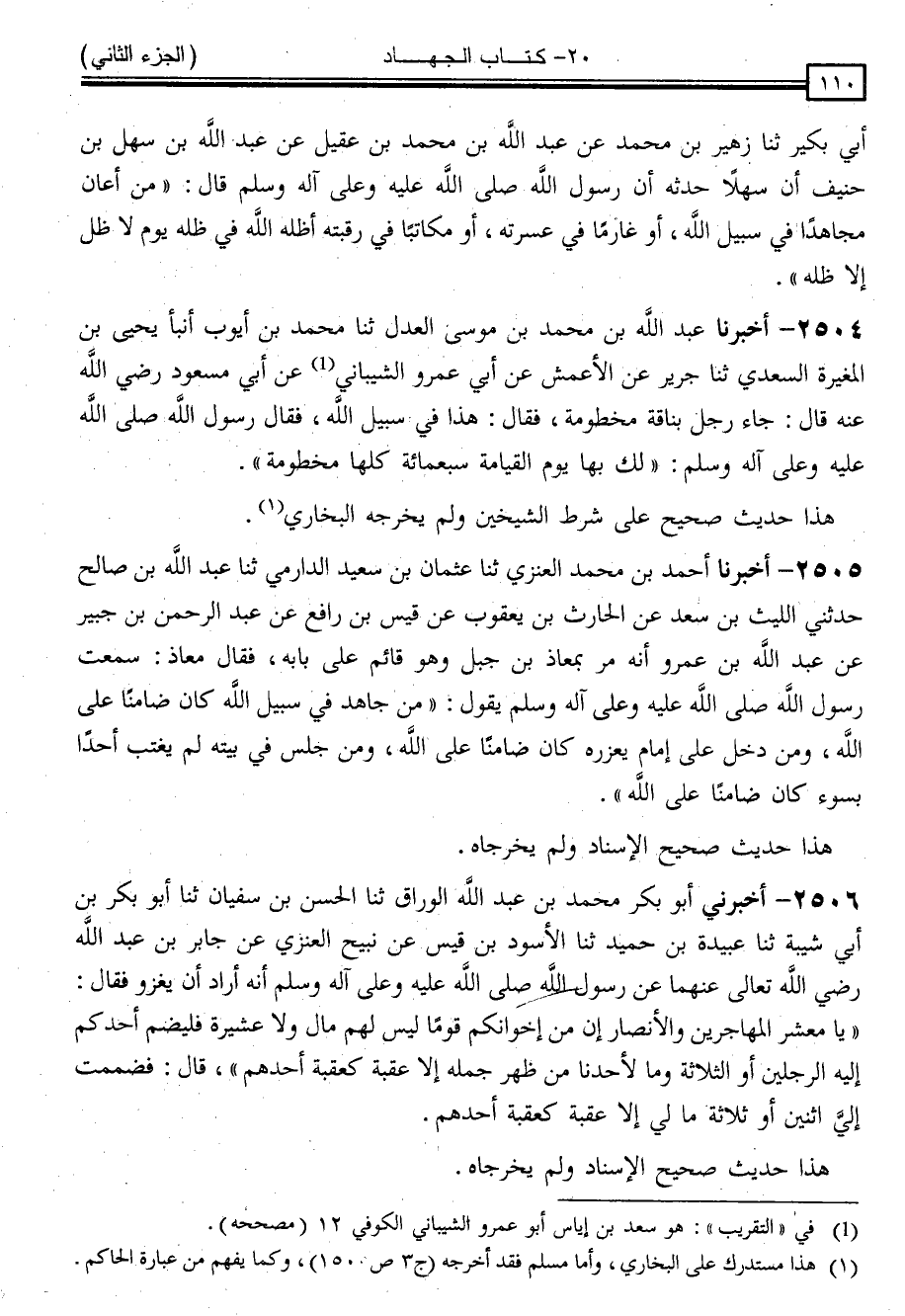 2506 - أَخْبَرَنِي أَبُو بَكْرٍ مُحَمَّدُ بْنُ عَبْدِ اللَّهِ الْوَرَّاقُ ، نا الْحَسَنُ بْنُ سُفْيَانَ ، نا أَبُو بَكْرِ بْنُ أَبِي شَيْبَةَ ، نا عَبِيدَةُ بْنُ حُمَيْدٍ ، نا الْأَسْوَدُ بْنُ قَيْسٍ ، عَنْ نُبَيْحٍ الْعَنَزِيِّ ، عَنْ جَابِرِ بْنِ عَبْدِ اللَّهِ رَضِيَ اللَّهُ تَعَالَى عَنْهُمَا ، عَنْ رَسُولِ اللَّهِ صَلَّى اللَّهُ عَلَيْهِ وَسَلَّمَ أَنَّهُ أَرَادَ أَنْ يَغْزُوَ فَقَالَ: " يَا مَعْشَرَ الْمُهَاجِرِينِ وَالْأَنْصَارِ ، إِنَّ مِنْ إِخْوَانِكُمْ قَوْمًا لَيْسَ لَهُمْ مَالٌ ، وَلَا عَشِيرَةٌ ، فَلْيَضُمَّ أَحَدُكُمْ إِلَيْهِ الرَّجُلَيْنِ ، أَوِ الثَّلَاثَةَ ، وَمَا لِأَحَدِنَا مِنْ ظَهْرٍ يَحَمِلُهُ إِلَّا عُقْبَةً كَعُقْبَةِ أَحَدِهِمْ ، قَالَ: فَضَمَمْتُ إِلَيَّ اثْنَيْنِ أَوْ ثَلَاثَةً مَا لِي إِلَّا عُقْبَةُ أَحَدِهِمْ "