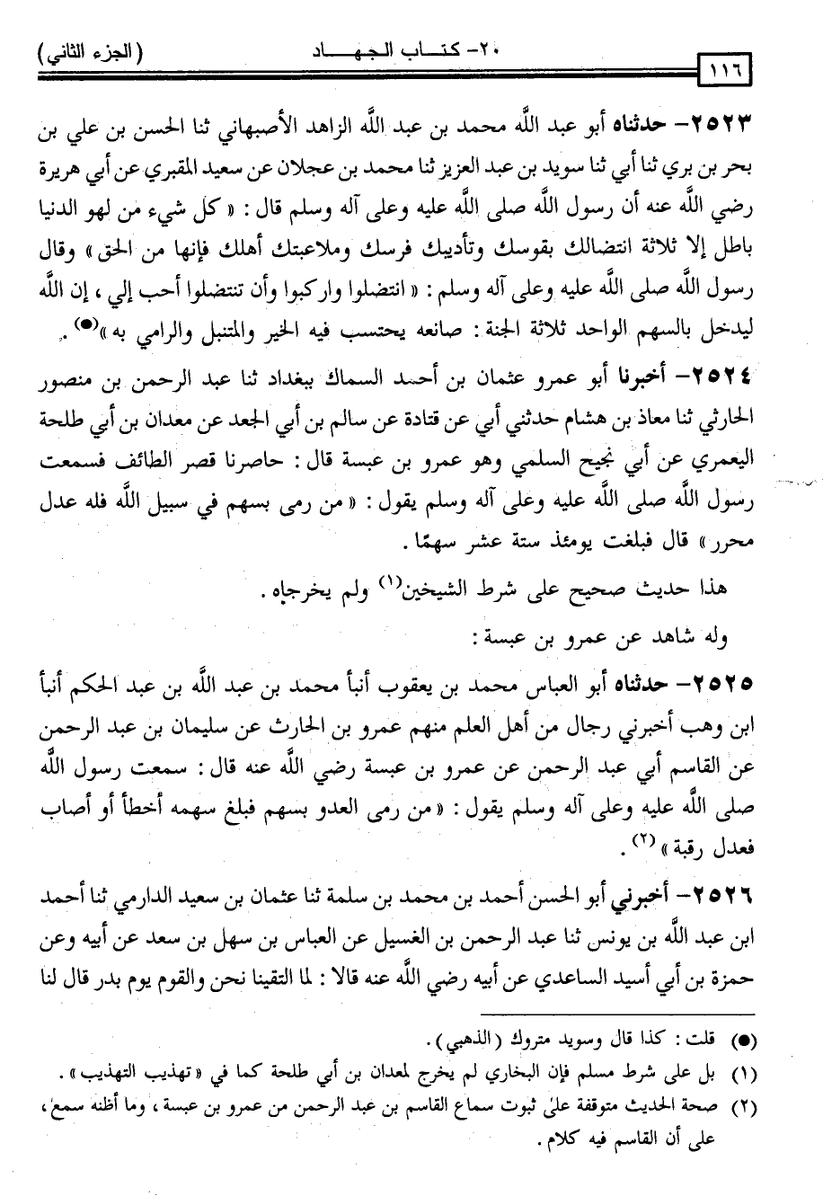 2525 - حَدَّثَنَاهُ أَبُو الْعَبَّاسِ مُحَمَّدُ بْنُ يَعْقُوبَ ، أَنْبَأَ مُحَمَّدُ بْنُ عَبْدِ اللَّهِ بْنِ عَبْدِ الْحَكَمِ ، أَنْبَأَ ابْنُ وَهْبٍ ، أَخْبَرَنِي رِجَالٌ مِنْ أَهْلِ الْعِلْمِ مِنْهُمْ عَمْرُو بْنُ الْحَارِثِ ، عَنْ سُلَيْمَانَ بْنِ عَبْدِ الرَّحْمَنِ ، عَنِ الْقَاسِمِ أَبِي عَبْدِ الرَّحْمَنِ ، عَنْ عَمْرِو بْنِ عَبَسَةَ رَضِيَ اللَّهُ عَنْهُ ، قَالَ: سَمِعْتُ رَسُولَ اللَّهِ صَلَّى اللَّهُ عَلَيْهِ وَسَلَّمَ ، يَقُولُ: " مَنْ رَمَى الْعَدُوَّ بِسَهْمٍ ، فَبَلَغَ سَهْمُهُ ، أَخْطَأَ أَوْ أَصَابَ فَعَدَلَ رَقَبَةً "