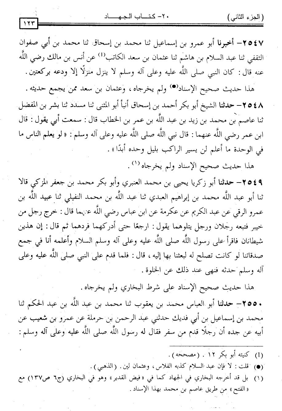 2549 - حَدَّثَنَا أَبُو زَكَرِيَّا يَحْيَى بْنُ مُحَمَّدٍ الْعَنْبَرِيُّ ، وَأَبُو بَكْرٍ مُحَمَّدُ بْنُ جَعْفَرٍ الْمُزَكِّي قَالَا: ثنا أَبُو عَبْدِ اللَّهِ مُحَمَّدُ بْنُ إِبْرَاهِيمَ الْعَبْدِيُّ ، ثنا عَبْدُ اللَّهِ بْنُ مُحَمَّدٍ النُّفَيْلِيُّ ، ثنا عُبَيْدُ اللَّهِ بْنُ عَمْرٍو الرَّقِّيُّ ، عَنْ عَبْدِ الْكَرِيمِ ، عَنْ عِكْرِمَةَ ، عَنِ ابْنِ عَبَّاسٍ رَضِيَ اللَّهُ عَنْهُمَا ، قَالَ: خَرَجَ رَجُلٌ مِنْ خَيْبَرَ فَتَبِعَهُ رَجُلَانِ وَرَجُلٌ يَتْلُوهُمَا يَقُولُ: ارْجِعَا حَتَّى أَدْرَكَهُمَا فَرَدَّهُمَا ، ثُمَّ قَالَ: إِنَّ هَذَيْنِ شَيْطَانَانِ ، فَاقْرَأْ عَلَى رَسُولِ اللَّهِ صَلَّى اللَّهُ عَلَيْهِ وَسَلَّمَ السَّلَامَ ، وَأَعْلِمْهُ أَنَّا فِي جَمْعِ صَدَقَاتِنَا ، لَوْ كَانَتْ تَصْلُحُ لَهُ لَبَعَثْنَا بِهَا إِلَيْهِ . قَالَ: فَلَمَّا قَدِمَ عَلَى النَّبِيِّ صَلَّى اللَّهُ عَلَيْهِ وَسَلَّمَ حَدَّثَهُ " فَنَهَى عِنْدَ ذَلِكَ عَنِ الْخَلْوَةِ "