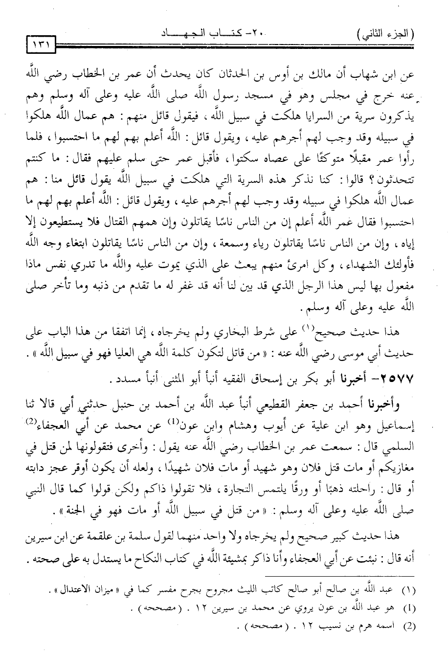 2577 - أَخْبَرَنَا أَبُو بَكْرِ بْنُ إِسْحَاقَ الْفَقِيهُ ، أَنْبَأَ أَبُو الْمُثَنَّى ، أَنْبَأَ مُسَدَّدٌ ، وَأَخْبَرَنَا أَحْمَدُ بْنُ جَعْفَرٍ الْقَطِيعِيُّ ، أَنْبَأَ عَبْدُ اللَّهِ بْنُ أَحْمَدَ بْنِ حَنْبَلٍ ، حَدَّثَنِي أَبِي قَالَا: ثنا إِسْمَاعِيلُ وَهُوَ ابْنُ عُلَيَّةَ ، عَنْ أَيُّوبَ ، وَهِشَامٌ ، وَابْنُ عَوْنٍ ، عَنْ مُحَمَّدٍ ، عَنْ أَبِي الْعَجْفَاءِ السُّلَمِيِّ ، قَالَ: سَمِعْتُ عُمَرَ بْنَ الْخَطَّابِ رَضِيَ اللَّهُ عَنْهُ ، يَقُولُ: وَأُخْرَى فَتَقُولُونُهَا لِمَنْ قُتِلَ فِي مَغَازِيكُمْ أَوْ مَاتَ: قُتِلَ فُلَانٌ وَهُوَ شَهِيدٌ أَوْ مَاتَ فُلَانٌ شَهِيدًا وَلَعَلَّهُ أَنْ يَكُونَ أَوْقَرَ عَجُزَ دَابَّتِهِ أَوْ قَالَ رَاحِلَتِهِ ذَهَبًا أَوْ وَرِقًا يَلْتَمِسُ التِّجَارَةَ فَلَا تَقُولُوا ذَاكُمْ وَلَكِنْ قُولُوا كَمَا قَالَ النَّبِيُّ صَلَّى اللَّهُ عَلَيْهِ وَسَلَّمَ: " مَنْ قُتِلَ فِي سَبِيلِ اللَّهِ أَوْ مَاتَ فَهُوَ فِي الْجَنَّةِ "