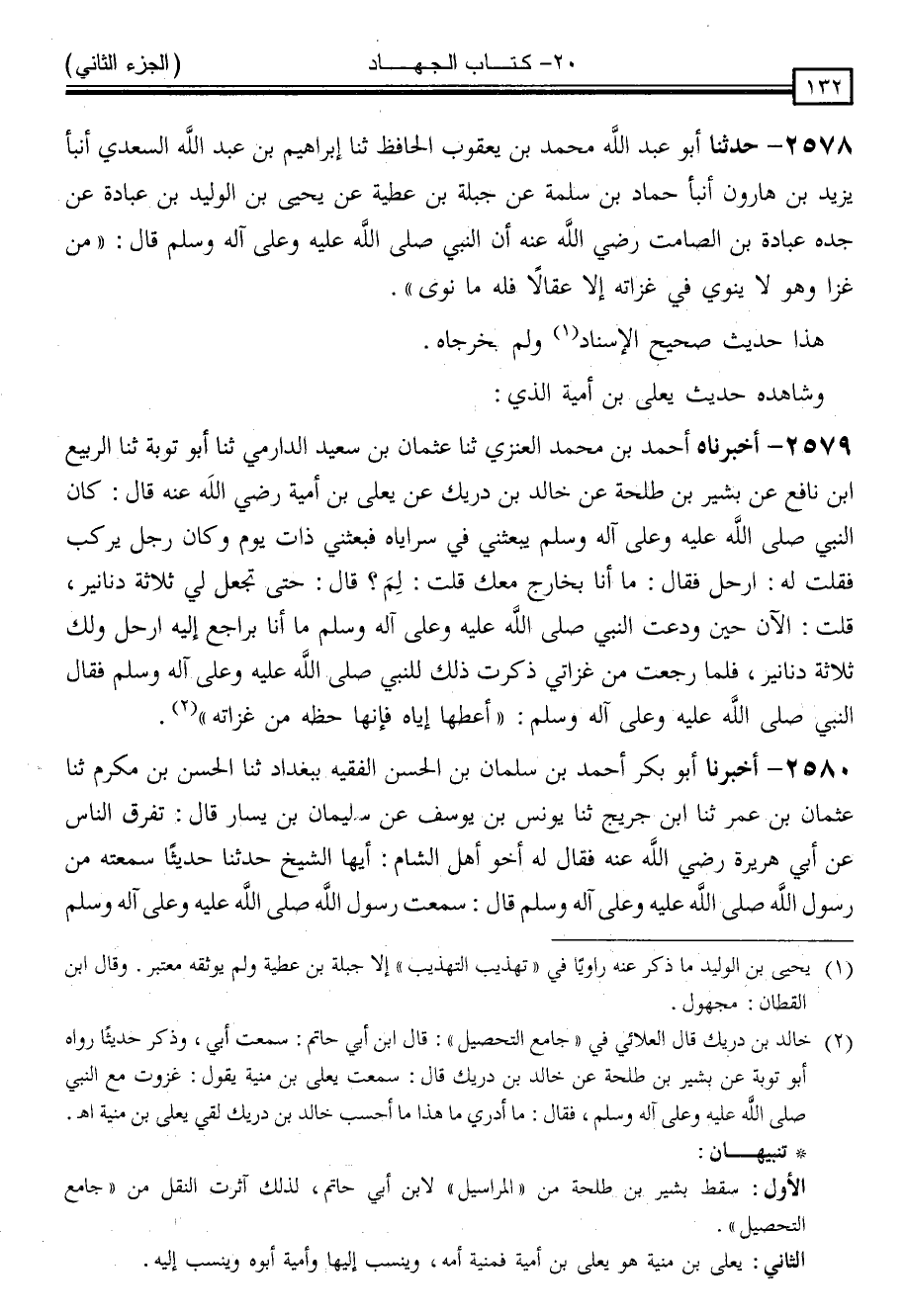 2578 - حَدَّثَنَا أَبُو عَبْدِ اللَّهِ مُحَمَّدُ بْنُ يَعْقُوبَ الْحَافِظُ ، ثنا إِبْرَاهِيمُ بْنُ عَبْدِ اللَّهِ السَّعْدِيُّ ، أَنْبَأَ يَزِيدُ بْنُ هَارُونَ ، أَنْبَأَ حَمَّادُ بْنُ سَلَمَةَ ، عَنْ جَبَلَةَ بْنِ عَطِيَّةَ ، عَنْ يَحْيَى بْنِ الْوَلِيدِ بْنِ عُبَادَةَ ، عَنْ جَدِّهِ عُبَادَةَ بْنِ الصَّامِتِ رَضِيَ اللَّهُ عَنْهُ ، أَنَّ النَّبِيَّ صَلَّى اللَّهُ عَلَيْهِ وَسَلَّمَ قَالَ: " مَنْ غَزَا وَهُوَ لَا يَنْوِي فِي غَزَاتِهِ إِلَّا عِقَالًا ، فَلَهُ مَا نَوَى "