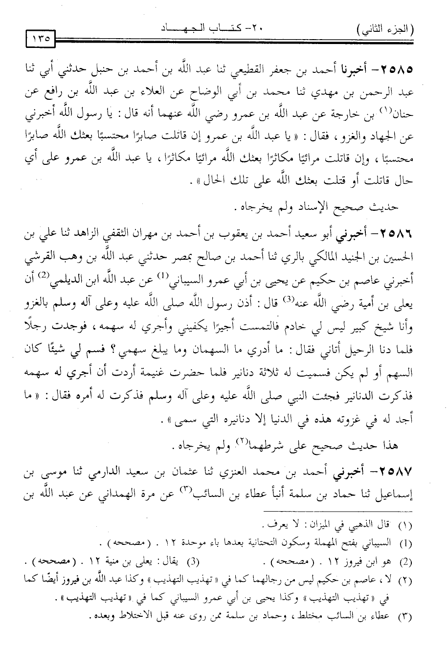 2585 - أَخْبَرَنَا أَحْمَدُ بْنُ جَعْفَرٍ الْقَطِيعِيُّ ، ثنا عَبْدُ اللَّهِ بْنُ أَحْمَدَ بْنِ حَنْبَلٍ ، حَدَّثَنِي أَبِي ، ثنا عَبْدُ الرَّحْمَنِ بْنُ مَهْدِيٍّ ، ثنا مُحَمَّدُ بْنُ أَبِي الْوَضَّاحِ ، عَنِ الْعَلَاءِ بْنِ عَبْدِ اللَّهِ بْنِ رَافِعٍ ، عَنْ حَنَانِ بْنِ خَارِجَةَ ، عَنْ عَبْدِ اللَّهِ بْنِ عَمْرٍو رَضِيَ اللَّهُ عَنْهُمَا ، أَنَّهُ قَالَ: يَا رَسُولَ اللَّهِ ، أَخْبِرْنِي عَنِ الْجِهَادِ وَالْغَزْوِ ، فَقَالَ: " يَا عَبْدَ اللَّهِ بْنَ عَمْرٍو إِنْ قَاتَلْتَ صَابِرًا مُحْتَسِبًا ، بَعَثَكَ اللَّهُ صَابِرًا مُحْتَسِبًا ، وَإِنْ قَاتَلْتَ مُرَائِيًا مُكَاثِرًا بَعَثَكَ اللَّهُ مُرَائِيًا مُكَاثِرًا ، يَا عَبْدَ اللَّهِ بْنَ عَمْرٍو عَلَى أَيِّ حَالٍ قَاتَلْتَ ، أَوْ قُتِلْتَ بَعَثَكَ اللَّهُ عَلَى تِلْكَ الْحَالِ "