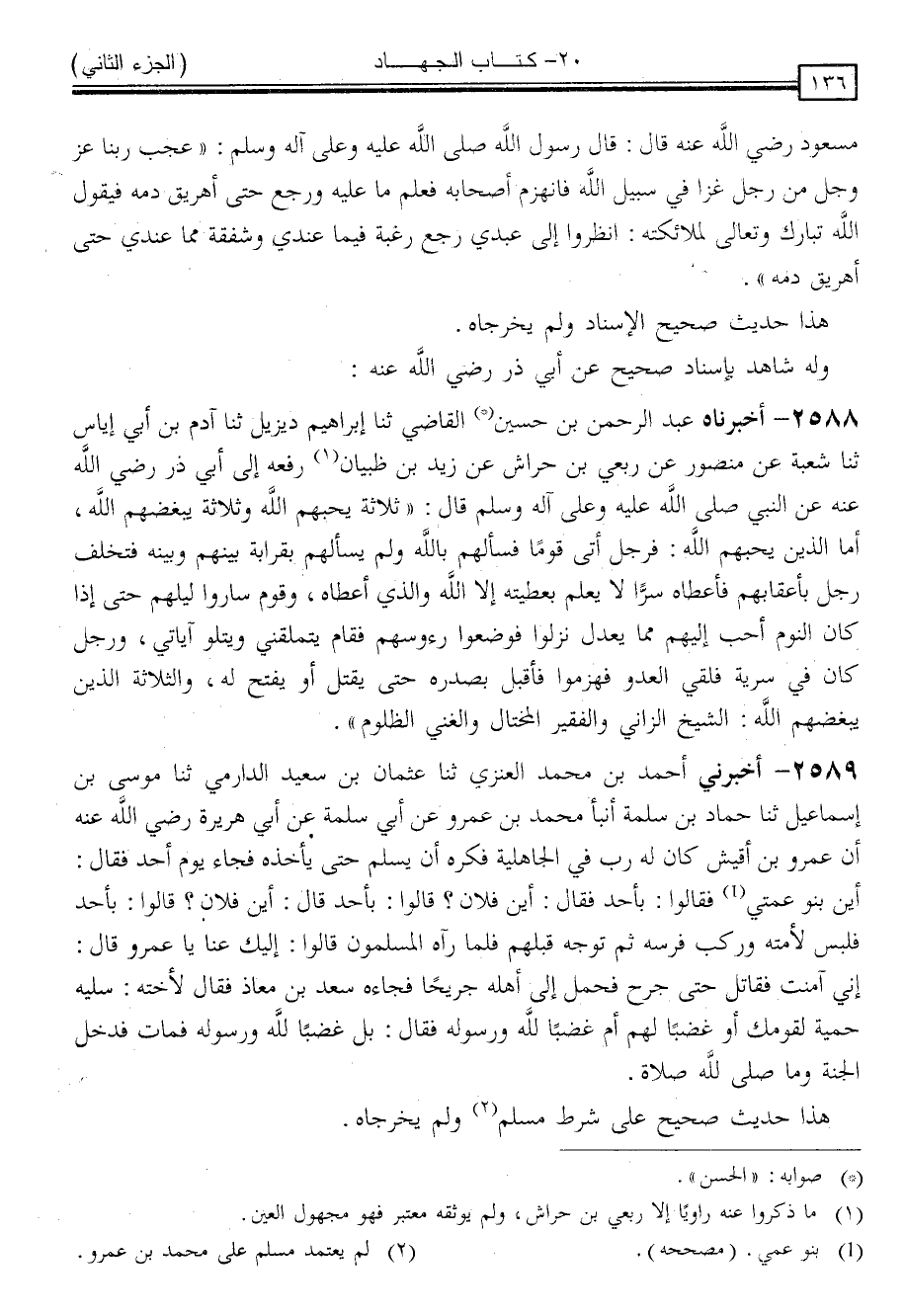 2588 - أَخْبَرَنَاهُ عَبْدُ الرَّحْمَنِ بْنُ الْحُسَيْنِ * الْقَاضِي ، ثنا إِبْرَاهِيمُ بْنُ دِيزِيلَ ، ثنا آدَمُ بْنُ أَبِي إِيَاسٍ ، ثنا شُعْبَةُ ، عَنْ مَنْصُورٍ ، عَنْ رِبْعِيِّ بْنِ حِرَاشٍ ، عَنْ زَيْدِ بْنِ ظَبْيَانَ ، رَفَعَهُ إِلَى أَبِي ذَرٍّ رَضِيَ اللَّهُ عَنْهُ ، عَنِ النَّبِيِّ صَلَّى اللَّهُ عَلَيْهِ وَسَلَّمَ قَالَ: " ثَلَاثَةٌ يُحِبُّهُمُ اللَّهُ وَثَلَاثَةٌ يُبْغِضُهُمُ اللَّهُ ؛ أَمَّا الَّذِينَ يُحِبُّهُمُ اللَّهُ فَرَجُلٌ أَتَى قَوْمًا فَسَأَلَهُمْ بِاللَّهِ وَلَمْ يَسْأَلْهُمْ بِقَرَابَةٍ بَيْنَهُمْ وَبَيْنَهُ ، فَتَخَلَّفَ رَجُلٌ بِأَعْقَابِهِمْ فَأَعْطَاهُ سِرًّا لَا يَعْلَمُ بِعَطِيَّتِهِ إِلَّا اللَّهُ وَالَّذِي أَعْطَاهُ ، وَقَوْمٌ سَارُوا لَيْلَهُمْ حَتَّى إِذَا كَانَ النَّوْمُ أَحَبَّ إِلَيْهِمْ مِمَّا يَعْدِلُ نَزَلُوا فَوَضَعُوا رُءُوسَهُمْ ، فَقَامَ يَتَمَلَّقُنِي وَيَتْلُوا آيَاتِي ، وَرَجُلٌ كَانَ فِي سَرِيَّةٍ ، فَلَقِيَ الْعَدُوَّ فَهُزِمُوا ، فَأَقْبَلَ بِصَدْرِهِ ، حَتَّى يُقْتَلَ أَوْ يُفْتَحَ لَهُ ، وَالثَّلَاثَةُ الَّذِينَ يُبْغِضُهُمُ اللَّهُ الشَّيْخُ الزَّانِي وَالْفَقِيرُ الْمُخْتَالُ وَالْغَنِيُّ الظَّلُومُ "
