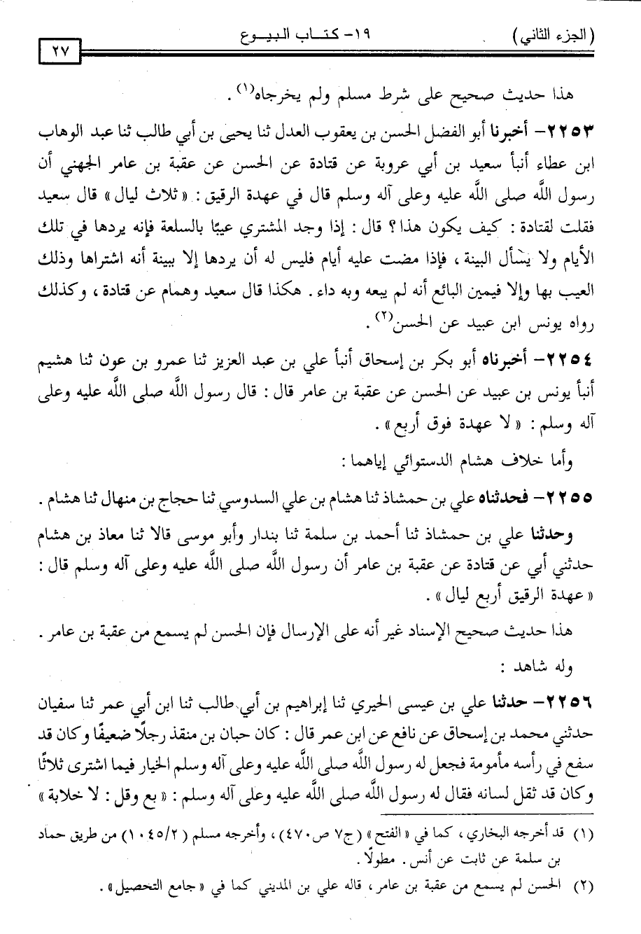2253 - أَخْبَرَنَا أَبُو الْفَضْلِ الْحَسَنُ بْنُ يَعْقُوبَ الْعَدْلُ ، حَدَّثَنَا يَحْيَى بْنُ أَبِي طَالِبٍ ، حَدَّثَنَا عَبْدُ الْوَهَّابِ بْنُ عَطَاءٍ ، أَنْبَأَ سَعِيدُ بْنُ أَبِي عَرُوبَةَ ، عَنْ قَتَادَةَ ، عَنِ الْحَسَنِ ، عَنْ عُقْبَةَ بْنِ عَامِرٍ الْجُهَنِيِّ ، أَنَّ رَسُولَ اللَّهِ صَلَّى اللَّهُ عَلَيْهِ وَسَلَّمَ قَالَ: " فِي عُهْدَةِ الرَّقِيقِ ثَلَاثُ لَيَالٍ " قَالَ سَعِيدٌ: فَقُلْتُ لِقَتَادَةَ: كَيْفَ يَكُونُ هَذَا ؟ قَالَ: إِذَا وَجَدَ الْمُشْتَرِي عَيْبًا بِالسِّلْعَةِ ، فَإِنَّهُ يَرُدُّهَا فِي تِلْكَ الْأَيَّامِ ، وَلَا يَسْأَلُ الْبَيِّنَةَ ، فَإِذَا مَضَتْ عَلَيْهِ أَيَّامٌ فَلَيْسَ لَهُ أَنْ يَرُدَّهَا إِلَّا ببَيِّنَةٍ أَنَّهُ اشْتَرَاهَا ، وَذَلِكَ الْعَيْبُ بِهَا وَإِلَّا فَيَمِينُ الْبَائِعِ أَنَّهُ لَمْ يَبِعْهُ وَبِهِ دَاءٌ .