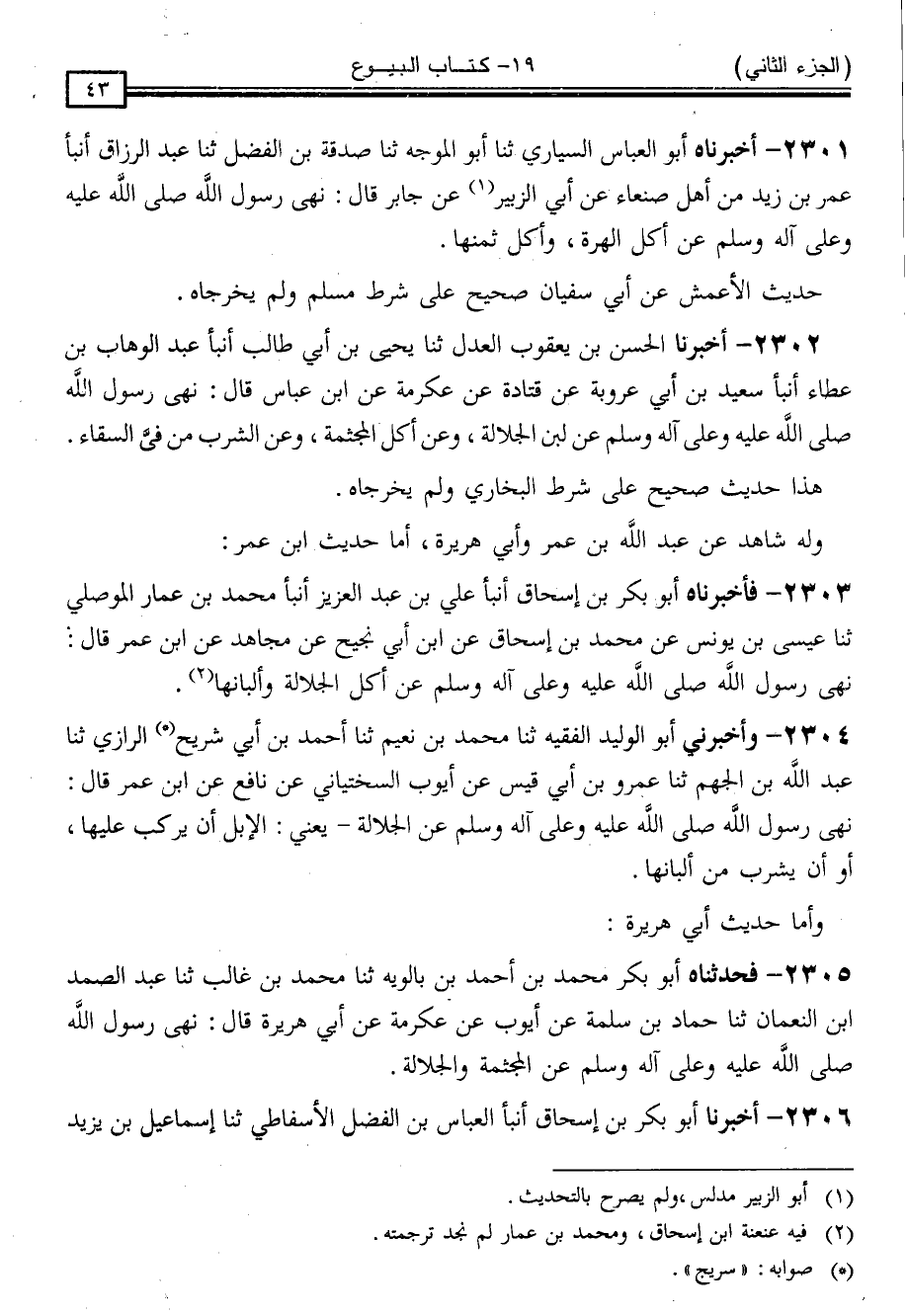 2301 - أَخْبَرَنَاهُ أَبُو الْعَبَّاسِ السَّيَّارِيُّ ، ثنا أَبُو الْمُوَجِّهِ ، ثنا صَدَقَةُ بْنُ الْفَضْلِ ، ثنا عَبْدُ الرَّزَّاقِ ، أَنْبَأَ عُمَرُ بْنُ زَيْدٍ ، مِنْ أَهْلِ صَنْعَاءَ عَنْ أَبِي الزُّبَيْرِ ، عَنْ جَابِرٍ ، قَالَ: " نَهَى رَسُولُ اللَّهِ صَلَّى اللَّهُ عَلَيْهِ وَسَلَّمَ عَنْ أَكْلِ الْهِرَّةِ وَأَكْلِ ثَمَنِهَا "