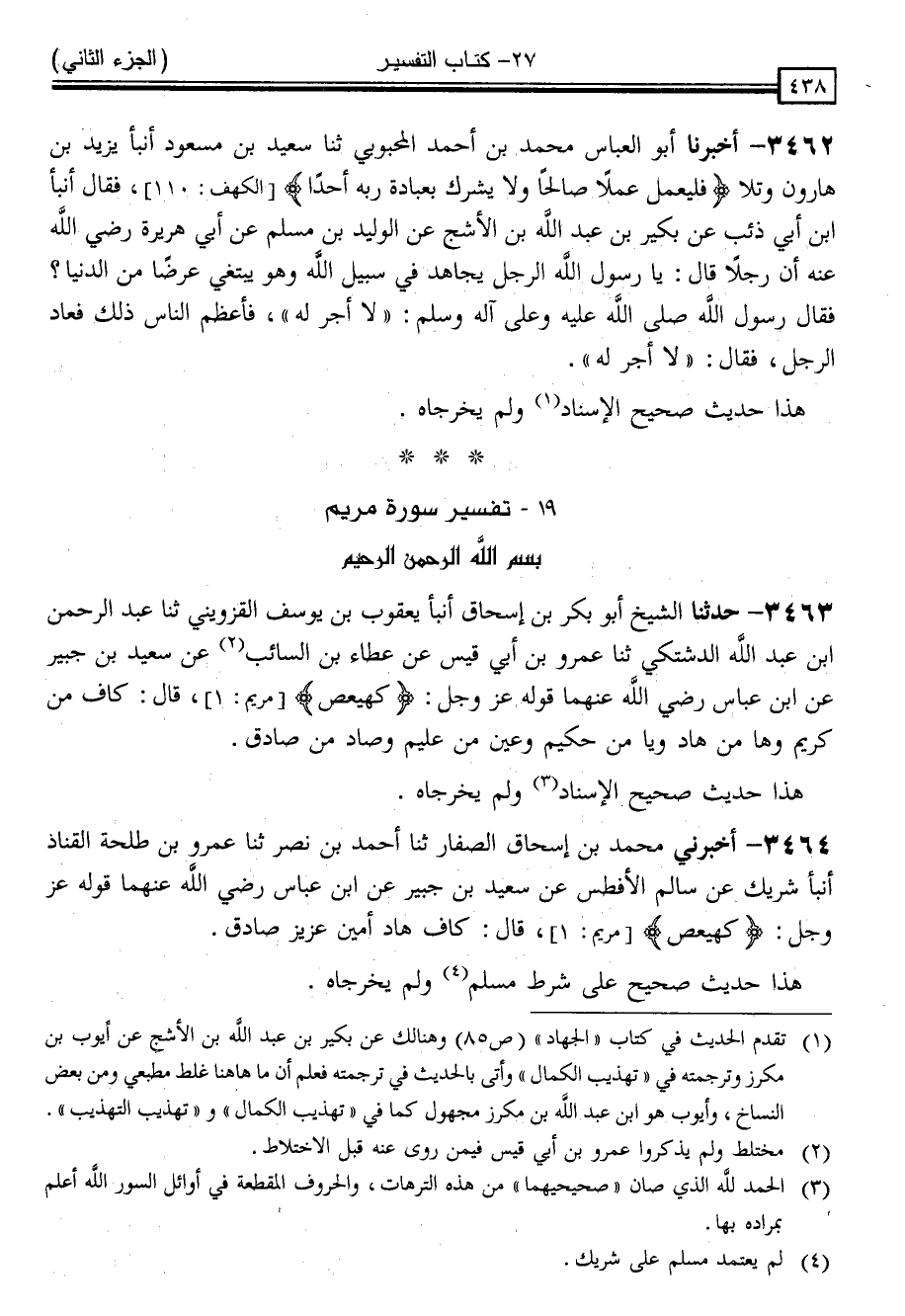 3464 - أَخْبَرَنِي مُحَمَّدُ بْنُ إِسْحَاقَ الصَّفَّارُ ، ثنا أَحْمَدُ بْنُ نَصْرٍ ، ثنا عَمْرُو بْنُ طَلْحَةَ الْقَنَّادُ ، أَنْبَأَ شَرِيكٌ ، عَنْ سَالِمٍ الْأَفْطَسِ ، عَنْ سَعِيدِ بْنِ جُبَيْرٍ ، عَنِ ابْنِ عَبَّاسٍ رَضِيَ اللَّهُ عَنْهُمَا ، قَوْلُهُ عَزَّ وَجَلَّ: { كهيعص } [مريم: 1] قَالَ: " كَافٌّ هَادٍ أَمِينٌ عَزِيزٌ صَادِقٌ "
