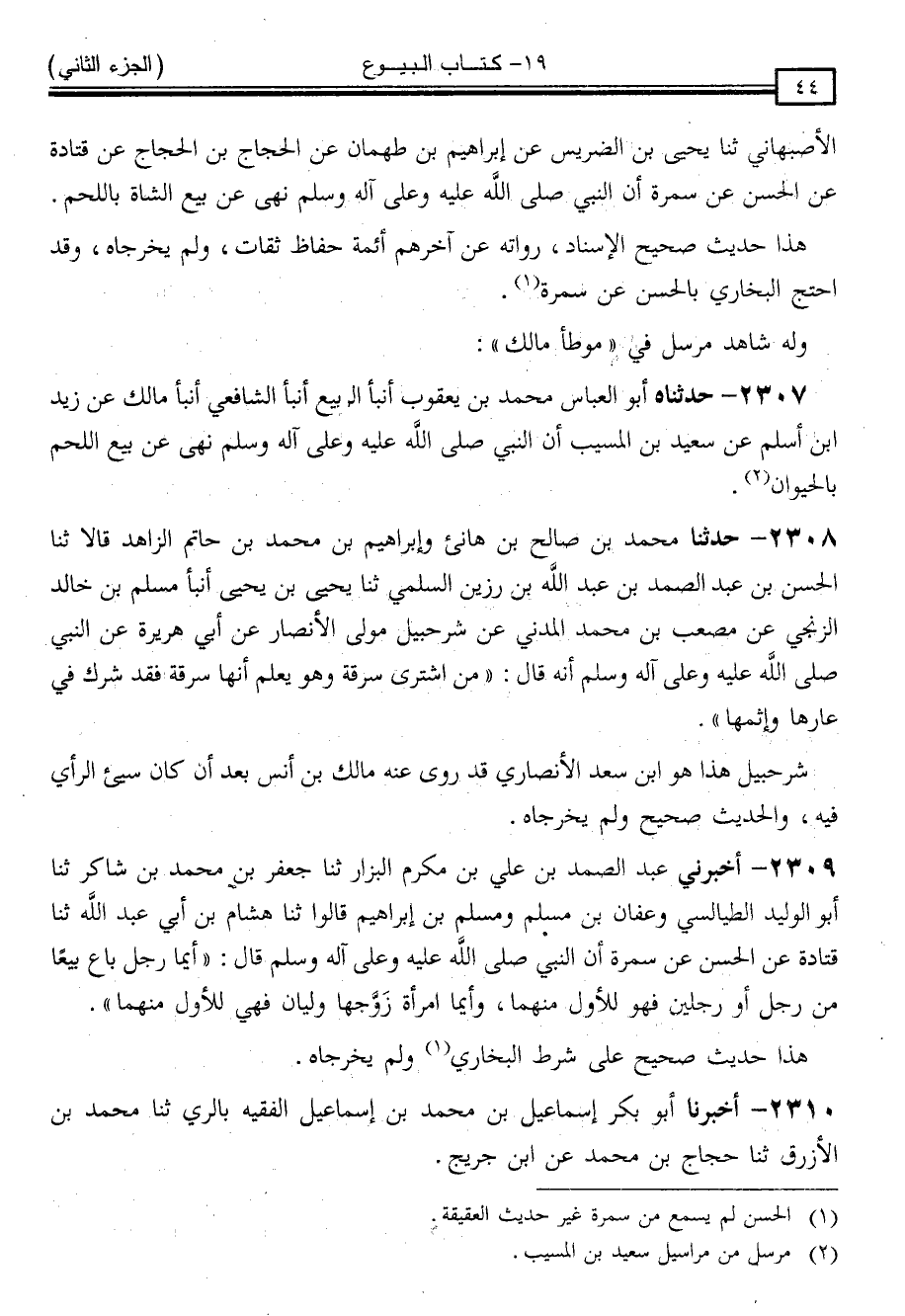2308 - حَدَّثَنَا مُحَمَّدُ بْنُ صَالِحِ بْنِ هَانِئٍ ، وَإِبْرَاهِيمُ بْنُ مُحَمَّدِ بْنِ حَاتِمٍ الزَّاهِدُ ، قَالَا: ثنا الْحَسَنُ بْنُ عَبْدِ الصَّمَدِ بْنِ عَبْدِ اللَّهِ بْنِ رَزِينٍ السُّلَمِيُّ ، ثنا يَحْيَى بْنُ يَحْيَى ، أَنْبَأَ مُسْلِمُ بْنُ خَالِدٍ الزَّنْجِيُّ ، عَنْ مُصْعَبِ بْنِ مُحَمَّدٍ الْمَدَنِيُّ ، عَنْ شُرَحْبِيلَ ، مَوْلَى الْأَنْصَارِ ، عَنْ أَبِي هُرَيْرَةَ ، عَنِ النَّبِيِّ صَلَّى اللَّهُ عَلَيْهِ وَسَلَّمَ أَنَّهُ قَالَ: " مَنِ اشْتَرَى سَرِقَةً ، وَهُوَ يَعْلَمُ أَنَّهَا سَرِقَةٌ ، فَقَدْ شُرِكَ فِي عَارِهَا وَإِثْمِهَا "