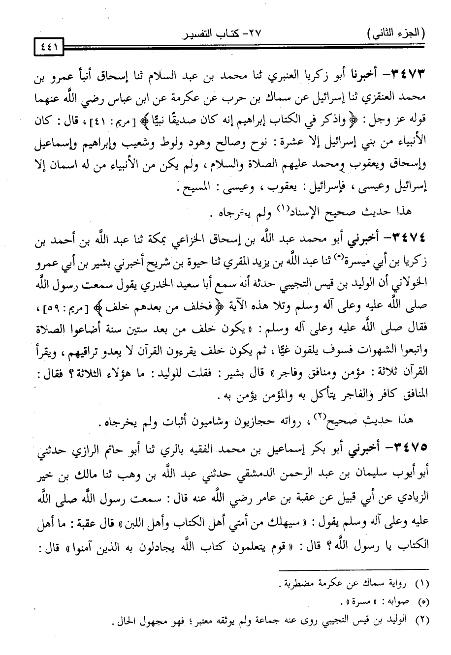 3473 - أَخْبَرَنَا أَبُو زَكَرِيَّا الْعَنْبَرِيُّ ، ثنا مُحَمَّدُ بْنُ عَبْدِ السَّلَامِ ، ثنا إِسْحَاقُ ، أَنْبَأَ عَمْرُو بْنُ مُحَمَّدٍ الْعَنْقَزِيُّ ، ثنا إِسْرَائِيلُ ، عَنْ سِمَاكِ بْنِ حَرْبٍ ، عَنْ عِكْرِمَةَ ، عَنِ ابْنِ عَبَّاسٍ رَضِيَ اللَّهُ عَنْهُمَا ، قَوْلُهُ عَزَّ وَجَلَّ { وَاذْكُرْ فِي الْكِتَابِ إِبْرَاهِيمَ إِنَّهُ كَانَ صِدِّيقًا نَبِيًّا } [مريم: 41] قَالَ: " كَانَ الْأَنْبِيَاءُ مِنْ بَنِي إِسْرَائِيلَ إِلَّا عَشَرَةٌ نُوحٌ وَصَالِحٌ ، وَهُودٌ ، وَلُوطٌ ، وَشُعَيْبٌ ، وَإِبْرَاهِيمُ ، وَإِسْمَاعِيلُ ، وَإِسْحَاقُ ، وَيَعْقُوبُ ، وَمُحَمَّدٌ عَلَيْهِمُ الصَّلَاةُ وَالسَّلَامُ ، وَلَمْ يَكُنْ مِنَ الْأَنْبِيَاءِ مَنْ لَهُ اسْمَانِ إِلَّا إِسْرَائِيلُ وَعِيسَى فَإِسْرَائِيلُ يَعْقُوبُ وَعِيسَى الْمَسِيحُ "