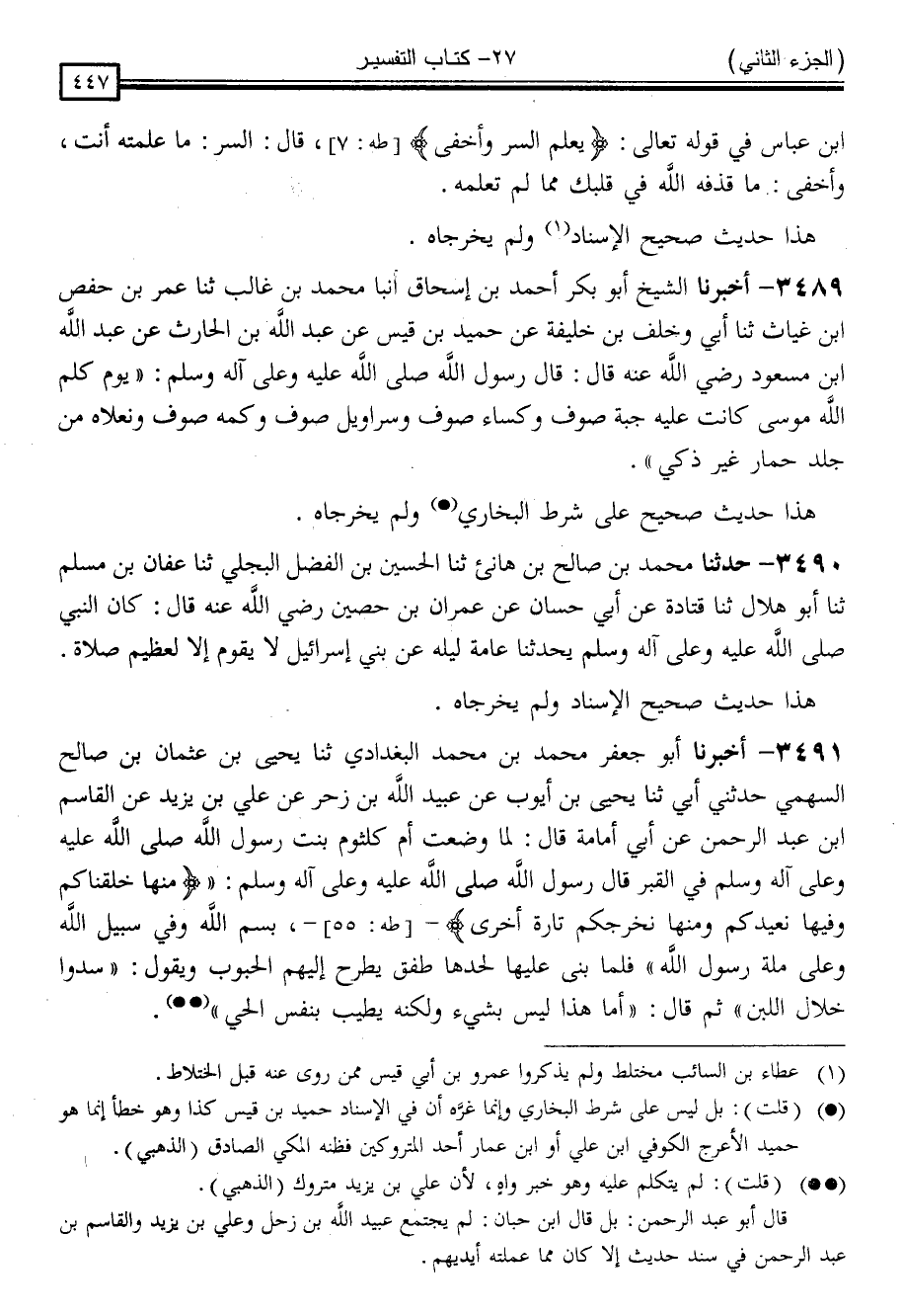 3489 - أَخْبَرَنَا الشَّيْخُ أَبُو بَكْرٍ أَحْمَدُ بْنُ إِسْحَاقَ ، أَنْبَأَ مُحَمَّدُ بْنُ غَالِبٍ ، ثنا عُمَرُ بْنُ حَفْصِ بْنِ غِيَاثٍ ، ثنا أَبِي وَخَلَفُ بْنُ خَلِيفَةَ ، عَنْ حُمَيْدِ بْنِ قَيْسٍ ، عَنْ عَبْدِ اللَّهِ بْنِ الْحَارِثِ ، عَنْ عَبْدِ اللَّهِ بْنِ مَسْعُودٍ رَضِيَ اللَّهُ عَنْهُ ، قَالَ: قَالَ رَسُولُ اللَّهِ صَلَّى اللَّهُ عَلَيْهِ وَسَلَّمَ: " يَوْمَ كَلَّمَ اللَّهُ مُوسَى كَانَتْ عَلَيْهِ جُبَّةٌ صُوفٌ ، وَكِسَاءٌ صُوفٌ ، وَسَرَاوِيلُ صُوفٌ ، وَكُمُّهُ صُوفٌ ، وَنَعْلَاهُ مِنْ جِلْدِ حِمَارٍ غَيْرِ ذَكِيٍّ "