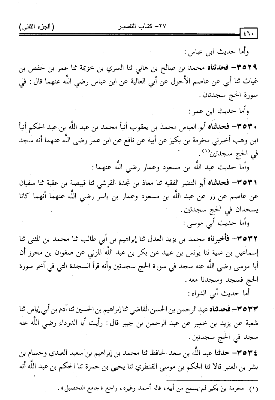 3533 - فَحَدَّثْنَاهُ عَبْدُ الرَّحْمَنِ بْنُ الْحَسَنِ الْقَاضِي ، ثنا إِبْرَاهِيمُ بْنُ الْحُسَيْنِ ، ثنا آدَمُ بْنُ أَبِي إِيَاسٍ ، ثنا شُعْبَةُ ، عَنْ يَزِيدَ بْنِ خُمَيْرٍ ، عَنْ عَبْدِ الرَّحْمَنِ بْنِ جُبَيْرٍ ، قَالَ: رَأَيْتُ أَبَا الدَّرْدَاءِ رَضِيَ اللَّهُ عَنْهُ " سَجَدَ فِي الْحَجِّ سَجْدَتَيْنِ "