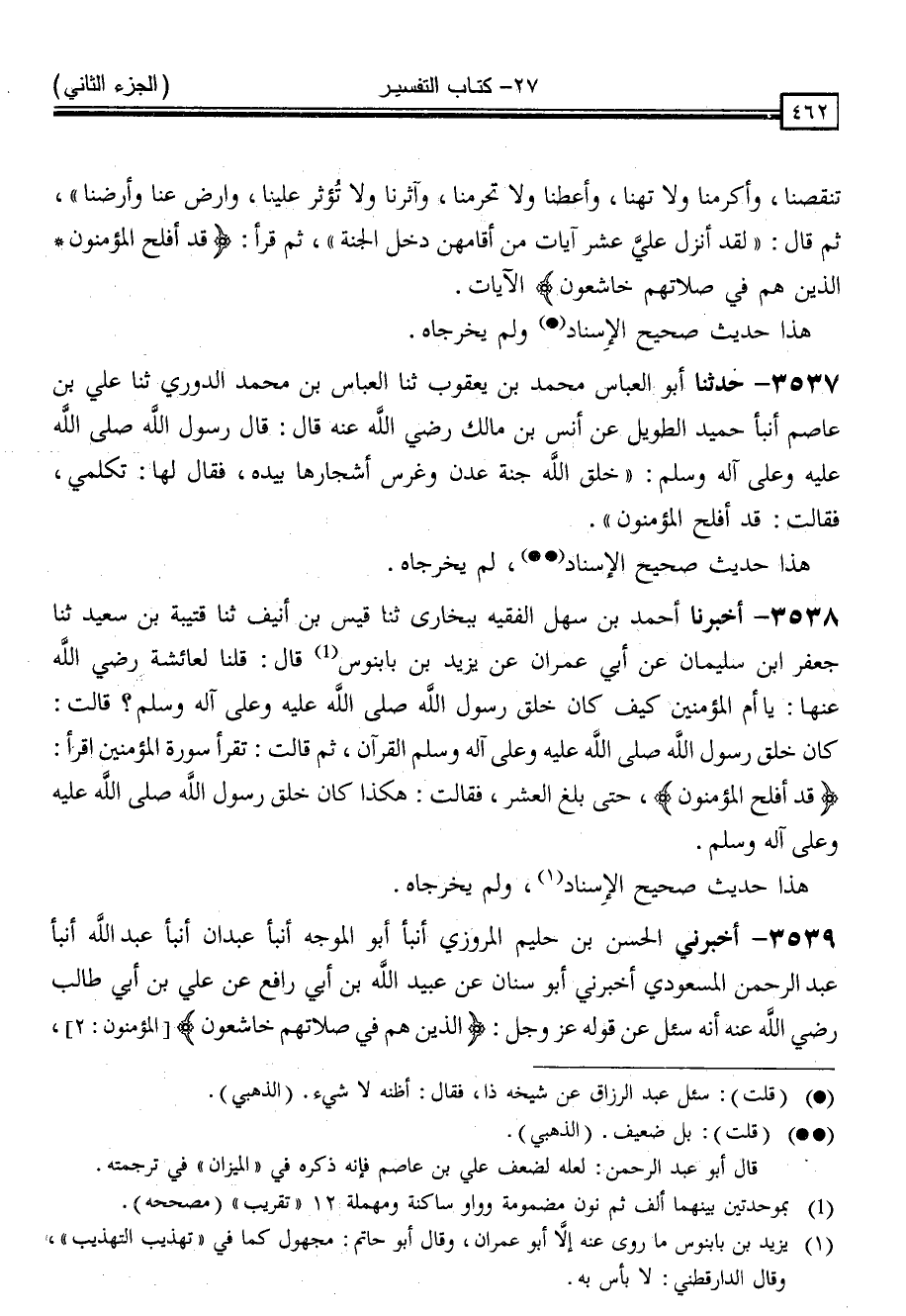 3538 - أَخْبَرَنَا أَحْمَدُ بْنُ سَهْلٍ الْفَقِيهُ بِبُخَارَى ، ثنا قَيْسُ بْنُ أُنَيْفٍ ، ثنا قُتَيْبَةُ بْنُ سَعِيدٍ ، ثنا جَعْفَرُ بْنُ سُلَيْمَانَ ، عَنْ أَبِي عِمْرَانَ ، عَنْ يَزِيدَ بْنِ بَابَنُوسَ ، قَالَ: قُلْنَا لِعَائِشَةَ رَضِيَ اللَّهُ عَنْهَا: يَا أُمَّ الْمُؤْمِنِينَ ، كَيْفَ كَانَ خَلْقُ رَسُولِ اللَّهِ صَلَّى اللَّهُ عَلَيْهِ وَسَلَّمَ ؟ قَالَتْ: " كَانَ خُلُقُ رَسُولِ اللَّهِ صَلَّى اللَّهُ عَلَيْهِ وَسَلَّمَ الْقُرْآنُ " . ثُمَّ قَالَتْ: تَقْرَأُ سُورَةَ الْمُؤْمِنِينَ ؟ اقْرَأْ { قَدْ أَفْلَحَ الْمُؤْمِنُونَ } [المؤمنون: 1] حَتَّى بَلَغَ الْعَشْرَ . فَقَالَتْ: هَكَذَا كَانَ خُلُقُ رَسُولِ اللَّهِ صَلَّى اللَّهُ عَلَيْهِ وَسَلَّمَ هَذَا حَدِيثٌ صَحِيحُ الْإِسْنَادِ وَلَمْ يُخْرِجَاهُ "