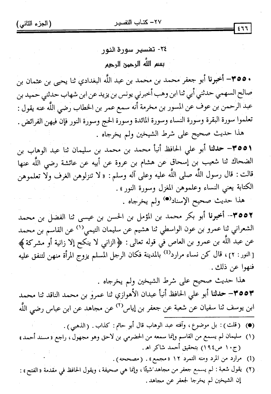 3553 - حَدَّثَنَا أَبُو عَلِيٍّ الْحَافِظُ ، أَنْبَأَ عَبْدَانُ الْأَهْوَازِيُّ ، ثنا عَمْرُو بْنُ مُحَمَّدٍ النَّاقِدُ ، ثنا مُحَمَّدُ بْنُ يُوسُفَ ، ثنا سُفْيَانُ ، عَنْ شُعْبَةَ ، عَنْ جَعْفَرِ بْنِ إِيَاسٍ ، عَنْ مُجَاهِدٍ ، عَنِ ابْنِ عَبَّاسٍ رَضِيَ اللَّهُ -[467]- عَنْهُمَا فِي قَوْلِهِ تَعَالَى: { لَا تَدْخُلُوا بُيُوتًا غَيْرَ بُيُوتِكُمْ حَتَّى تَسْتَأْنِسُوا } [النور: 27] قَالَ: " أَخْطَأَ الْكَاتِبُ حَتَّى تَسْتَأْذِنُوا "