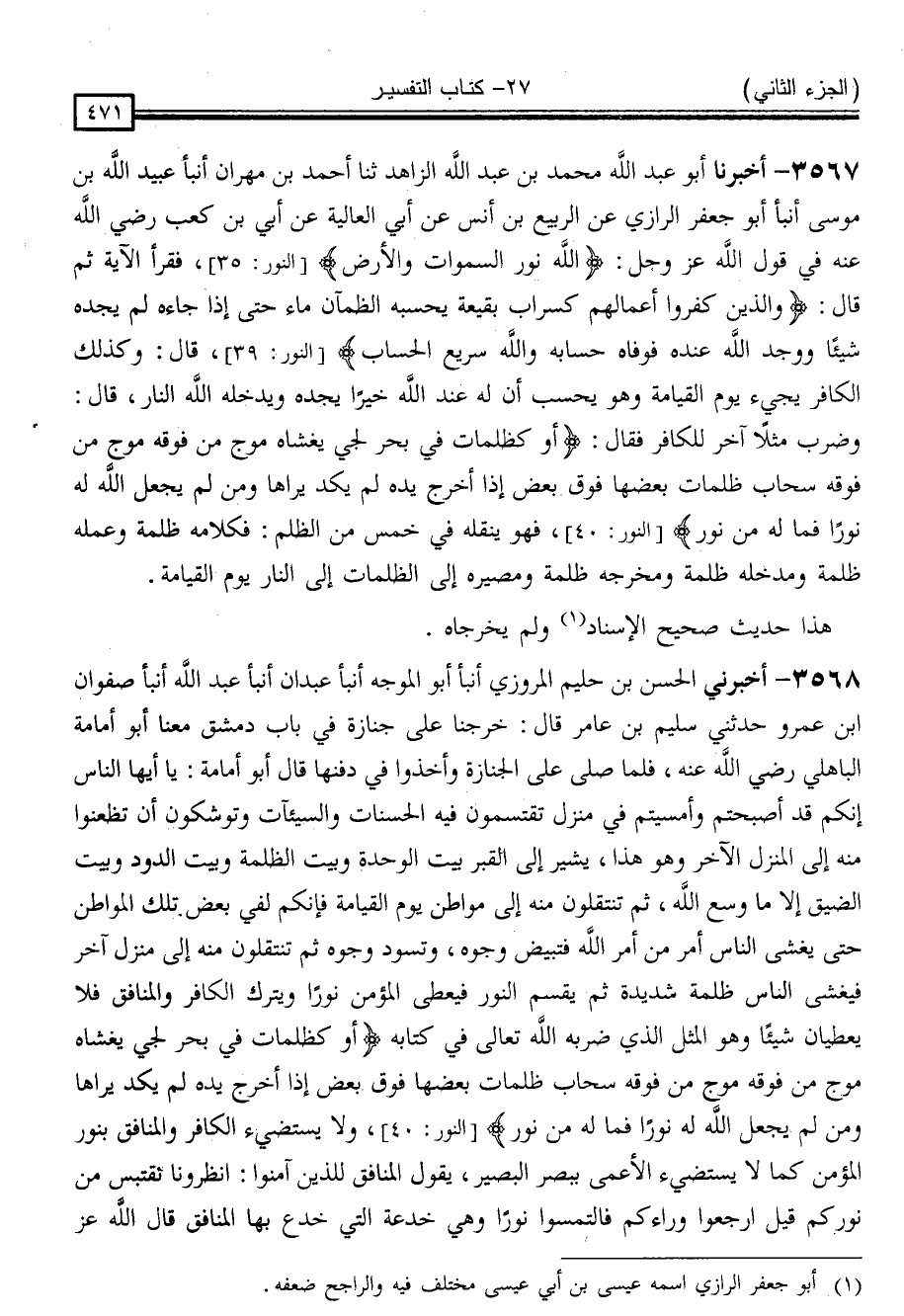 3567 - أَخْبَرَنَا أَبُو عَبْدِ اللَّهِ مُحَمَّدُ بْنُ عَبْدِ اللَّهِ الزَّاهِدُ ، ثنا أَحْمَدُ بْنُ مِهْرَانَ ، أَنْبَأَ عُبَيْدُ اللَّهِ بْنُ مُوسَى ، أَنْبَأَ أَبُو جَعْفَرٍ الرَّازِيُّ ، عَنِ الرَّبِيعِ بْنِ أَنَسٍ ، عَنْ أَبِي الْعَالِيَةَ ، عَنْ أُبَيِّ بْنِ كَعْبٍ رَضِيَ اللَّهُ عَنْهُ ، فِي قَوْلِ اللَّهِ عَزَّ وَجَلَّ: " { اللَّهُ نُورُ السَّمَوَاتِ وَالْأَرْضِ } فَقَرَأَ الْآيَةَ ، ثُمَّ قَالَ: { وَالَّذِينَ كَفَرُوا أَعْمَالُهُمْ كَسَرَابٍ بِقِيعَةٍ يَحْسَبُهُ الظَّمْآنُ مَاءً حَتَّى إِذَا جَاءَهُ لَمْ يَجِدْهُ شَيْئًا ، وَوَجَدَ اللَّهَ عِنْدَهُ فَوَفَّاهُ حِسَابَهُ وَاللَّهُ سَرِيعُ الْحِسَابِ } [النور: 39] قَالَ: " وَكَذَلِكَ الْكَافِرُ يَجِيءُ يَوْمَ الْقِيَامَةِ وَهُوَ يَحْسِبُ أَنَّ لَهُ عِنْدَ اللَّهِ خَيْرًا يَجِدُهُ وَيُدْخِلُهُ اللَّهُ النَّارَ " قَالَ: وَضَرَبَ مَثَلًا آخَرَ لِلْكَافِرِ ، فَقَالَ: { أَوْ كَظُلُمَاتٍ فِي بَحْرٍ لُجِّيٍّ يَغْشَاهُ مَوْجٌ مِنْ فَوْقِهِ مَوْجٌ مِنْ فَوْقِهِ سَحَابٌ ظُلُمَاتٌ بَعْضُهَا فَوْقَ بَعْضٍ ، إِذَا أَخْرَجَ يَدَهُ لَمْ يَكَدْ يَرَاهَا وَمَنْ لَمْ يَجْعَلِ اللَّهُ لَهُ نُورًا فَمَا لَهُ مِنْ نُورٍ } [النور: 40] ، فَهُوَ يَنْقُلُهُ فِي خَمْسٍ مِنَ الظُّلَمِ فَكَلَامُهُ ظُلْمَةٌ ، وَعَمَلُهُ ظُلْمَةٌ ، وَمَدْخَلُهُ ظُلْمَةٌ ، وَمَخْرَجُهُ ظُلْمَةٌ ، وَمَصِيرُهُ إِلَى الظُّلُمَاتِ إِلَى النَّارِ يَوْمَ الْقِيَامَةِ "