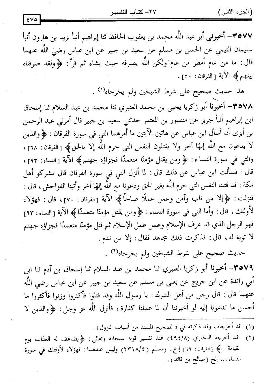 3578 - أَخْبَرَنَا أَبُو زَكَرِيَّا يَحْيَى بْنُ مُحَمَّدٍ الْعَنْبَرِيُّ ، ثنا مُحَمَّدُ بْنُ عَبْدِ السَّلَامِ ، ثنا إِسْحَاقُ بْنُ إِبْرَاهِيمَ ، أَنْبَأَ جَرِيرٌ ، عَنْ مَنْصُورِ بْنِ الْمُعْتَمِرِ ، حَدَّثَنِي سَعِيدُ بْنُ جُبَيْرٍ ، قَالَ: أَمَرَنِي عَبْدُ الرَّحْمَنِ بْنُ أَبْزَى أَنْ أَسْأَلَ ابْنَ عَبَّاسٍ ، عَنْ هَاتَيْنِ الْآيَتَيْنِ مَا أَمْرُهُمَا الَّتِي فِي سُورَةِ الْفُرْقَانِ: { وَالَّذِينَ لَا يَدْعُونَ مَعَ اللَّهِ إِلَهًا آخَرَ وَلَا يَقْتُلُونَ النَّفْسَ الَّتِي حَرَّمَ اللَّهُ إِلَّا بِالْحَقِّ } [الفرقان: 68] ، وَالَّتِي فِي سُورَةِ النِّسَاءِ { وَمَنْ يَقْتُلْ مُؤْمِنًا مُتَعَمِّدًا فَجَزَاؤُهُ جَهَنَّمَ } [النساء: 93] الْآيَةُ . قَالَ: فَسَأَلْتُ ابْنَ عَبَّاسٍ عَنْ ذَلِكَ قَالَ: " لَمَّا أَنْزَلَ الَّتِي فِي سُورَةِ الْفُرْقَانِ قَالَ مُشْرِكُوا أَهْلِ مَكَّةَ قَدْ قَتَلْنَا النَّفْسَ الَّتِي حَرَّمَ اللَّهُ بِغَيْرِ الْحَقِّ وَدَعَوْنَا مَعَ اللَّهِ إِلَهًا آخَرَ وَأَتَيْنَا الْفَوَاحِشَ " قَالَ: فَنَزَلَتْ { إِلَّا مَنْ تَابَ وَآمَنَ وَعَمِلَ عَمَلًا صَالِحًا } [الفرقان: 70] الْآيَةَ . قَالَ: " فَهَؤُلَاءِ لِأُولَئِكَ " قَالَ: " وَأَمَّا الَّتِي فِي سُورَةِ النِّسَاءِ { وَمَنْ يَقْتُلْ مُؤْمِنًا مُتَعَمِّدًا } [النساء: 93] الْآيَةُ فَهُوَ الرَّجُلُ الَّذِي قَدْ عَرَفَ الْإِسْلَامَ وَعَمِلَ عَمَلَ الْإِسْلَامِ ، ثُمَّ قَتَلَ مُؤْمِنًا مُتَعَمِّدًا فَجَزَاؤُهُ جَهَنَّمَ لَا تَوْبَةَ لَهُ . قَالَ: فَذَكَرْتُ ذَلِكَ لِمُجَاهِدٍ فَقَالَ: إِلَّا مَنْ نَدِمَ "