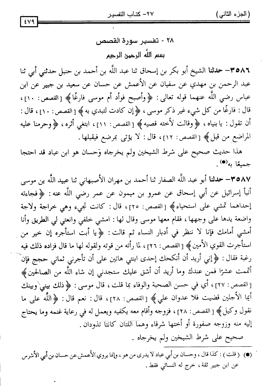 3586 - حَدَّثَنَا الشَّيْخُ أَبُو بَكْرِ بْنُ إِسْحَاقَ ، ثنا عَبْدُ اللَّهِ بْنُ أَحْمَدَ بْنِ حَنْبَلٍ ، حَدَّثَنِي أَبِي ، ثنا عَبْدُ الرَّحْمَنِ بْنُ مَهْدِيٍّ ، عَنْ سُفْيَانَ ، عَنِ الْأَعْمَشِ ، عَنْ حَسَّانَ ، عَنْ سَعِيدِ بْنِ جُبَيْرٍ ، عَنِ ابْنِ عَبَّاسٍ رَضِيَ اللَّهُ عَنْهُمَا ، قَوْلُهُ تَعَالَى: { وَأَصْبَحَ فُؤَادُ أُمِّ مُوسَى فَارِغًا } [القصص: 10] قَالَ: " فَارِغًا مِنْ كُلِّ شَيْءٍ غَيْرِ ذِكْرِ مُوسَى " { إِنْ كَادَتْ لَتُبْدِي بِهِ } [القصص: 10] قَالَ: " أَنْ تَقُولَ يَا بُنَيَّاهُ " { وَقَالَتْ لِأُخْتِهِ قُصِّيهِ } [القصص: 11] ابْتَغِي أَثَرَهُ { وَحَرَّمْنَا عَلَيْهِ الْمَرَاضِعَ مِنْ قَبْلُ } [القصص: 12] قَالَ: " لَا يُؤْتَى بِمُرْضِعٍ فَيَقْبَلُهَا "