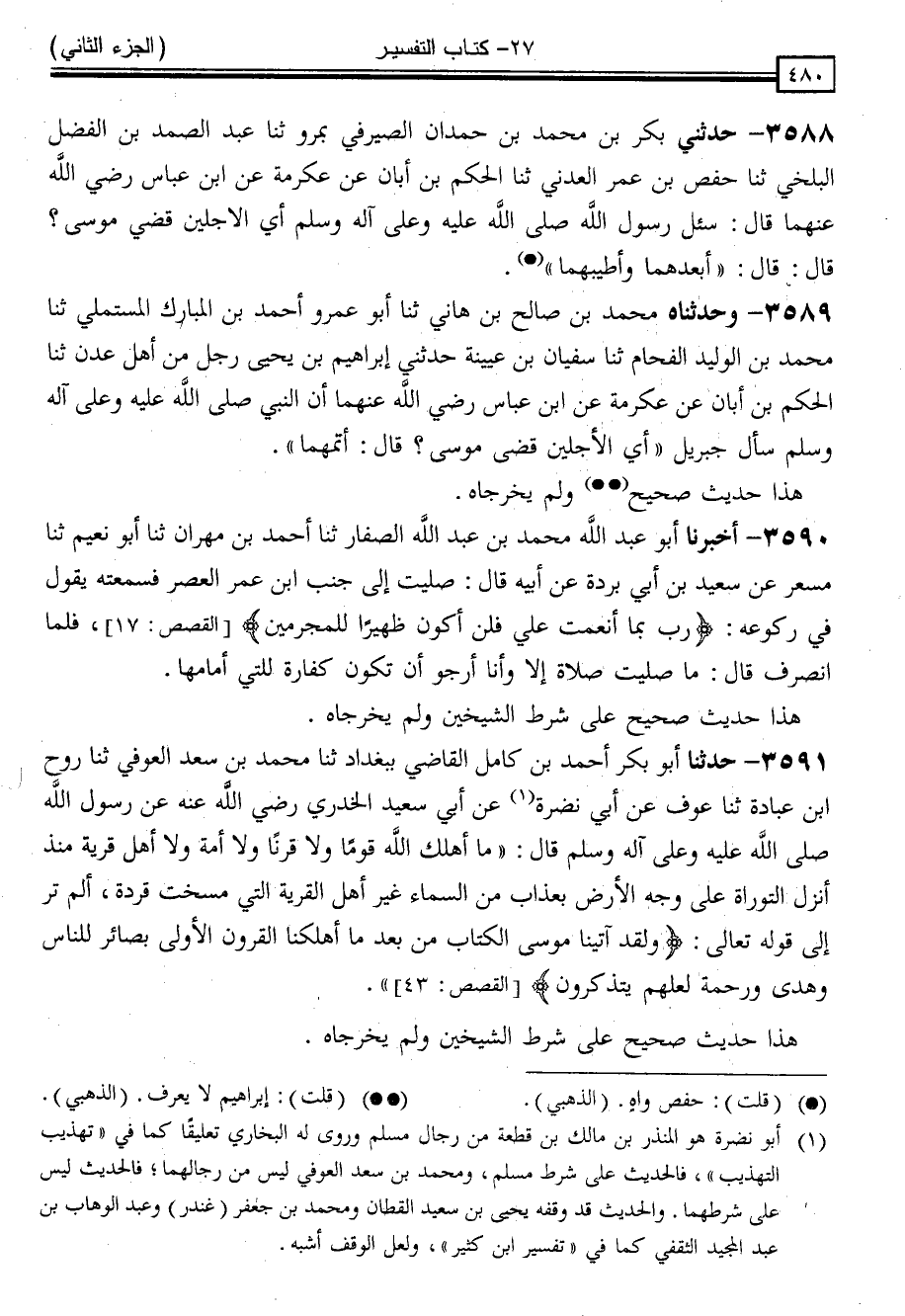 3588 - حَدَّثَنِي بَكْرُ بْنُ مُحَمَّدِ بْنِ حَمْدَانَ الصَّيْرَفِيُّ ، بِمَرْوَ ، ثنا عَبْدُ الصَّمَدِ بْنُ الْفَضْلِ الْبَلْخِيُّ ، ثنا حَفْصُ بْنُ عُمَرَ الْعَدَنِيُّ ، ثنا الْحَكَمُ بْنُ أَبَانَ ، عَنْ عِكْرِمَةَ ، عَنِ ابْنِ عَبَّاسٍ رَضِيَ اللَّهُ عَنْهُمَا ، قَالَ: سُئِلَ رَسُولُ اللَّهِ صَلَّى اللَّهُ عَلَيْهِ وَسَلَّمَ: أَيُّ الْأَجَلَيْنِ قَضَى مُوسَى ؟ قَالَ: قَالَ: " أَبْعَدَهُمَا وَأَطْيَبَهُمَا "
