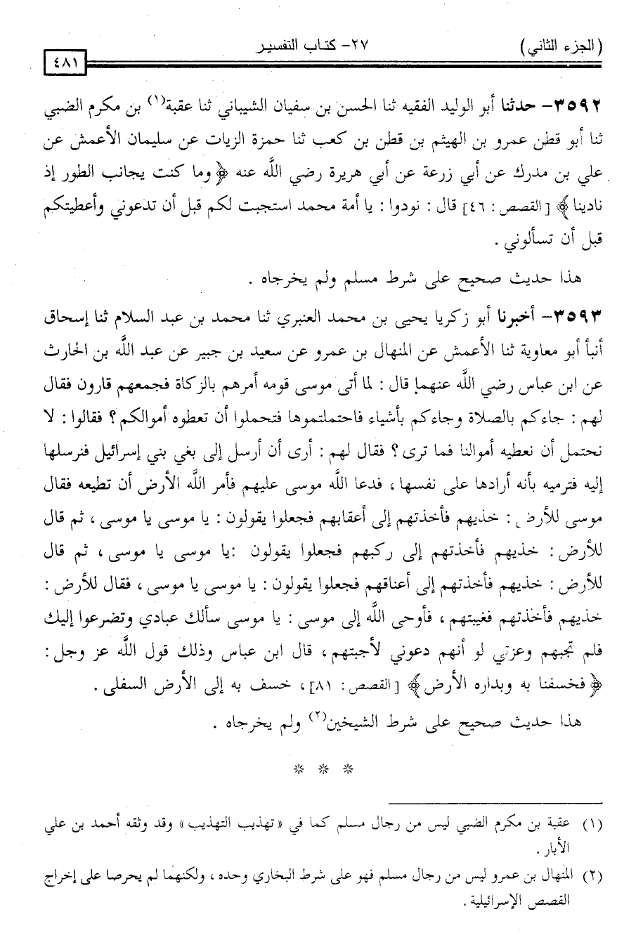 3593 - أَخْبَرَنَا أَبُو زَكَرِيَّا يَحْيَى بْنُ مُحَمَّدٍ الْعَنْبَرِيُّ ، ثنا مُحَمَّدُ بْنُ عَبْدِ السَّلَامِ ، ثنا إِسْحَاقُ ، أَنْبَأَ أَبُو مُعَاوِيَةَ ، ثنا الْأَعْمَشُ ، عَنِ الْمِنْهَالِ بْنِ عَمْرٍو ، عَنْ سَعِيدِ بْنِ جُبَيْرٍ ، عَنْ عَبْدِ اللَّهِ بْنِ الْحَارِثِ ، عَنِ ابْنِ عَبَّاسٍ رَضِيَ اللَّهُ عَنْهُمَا ، قَالَ: لَمَّا أَتَى مُوسَى قَوْمَهُ أَمَرَهُمْ بِالزَّكَاةِ فَجَمَعَهُمْ قَارُونُ فَقَالَ لَهُمْ: " جَاءَكُمْ بِالصَّلَاةِ وَجَاءَكُمْ بِأَشْيَاءَ فَاحْتَمَلْتُمُوهَا فَتَحَمَّلُوا أَنْ تُعْطُوهُ أَمْوَالَكُمْ " . فَقَالُوا: لَا نَحْتَمِلُ أَنْ نُعْطِيَهُ أَمْوَالَنَا فَمَا تَرَى ؟ فَقَالَ لَهُمْ: " أَرَى أَنْ أُرْسِلَ إِلَى بَغِيِّ بَنِي إِسْرَائِيلَ فَنُرْسِلَهَا إِلَيْهِ فَتَرْمِيَهُ بِأَنَّهُ أَرَادَهَا عَلَى نَفْسِهَا ، فَدَعَا مُوسَى عَلَيْهِمْ فَأَمَرَ اللَّهُ الْأَرْضَ أَنْ تُطِيعَهُ ، فَقَالَ مُوسَى لِلْأَرْضِ: خُذِيهِمْ فَأَخَذَتْهُمْ إِلَى أَعْقَابِهِمْ " فَجَعَلُوا يَقُولُونَ: يَا مُوسَى يَا مُوسَى ، ثُمَّ قَالَ لِلْأَرْضِ: " خُذِيهِمْ فَأَخَذَتْهُمْ إِلَى رُكَبِهِمْ " فَجَعَلُوا يَقُولُونَ: يَا مُوسَى يَا مُوسَى ، ثُمَّ قَالَ: " لِلْأَرْضِ خُذِيهِمْ فَأَخَذَتْهُمْ إِلَى أَعْنَاقِهِمْ " فَجَعَلُوا يَقُولُونَ: يَا مُوسَى يَا مُوسَى فَقَالَ لِلْأَرْضِ: " خُذِيهِمْ فَأَخَذَتْهُمْ فَغَيَّبَتْهُمْ ، فَأَوْحَى اللَّهُ إِلَى مُوسَى يَا مُوسَى سَأَلَكَ عِبَادِي وَتَضَرَّعُوا إِلَيْكَ فَلَمْ تُجِبْهُمْ ، وَعِزَّتِي لَوْ أَنَّهُمْ دَعَوْنِي لَأَجَبْتُهُمْ ، قَالَ ابْنُ عَبَّاسٍ: وَذَلِكَ قَوْلُ اللَّهِ عَزَّ وَجَلَّ { فَخَسَفْنَا بِهِ وَبِدَارِهِ الْأَرْضَ } [القصص: 81] خُسِفَ بِهِ إِلَى الْأَرْضِ السُّفْلَى