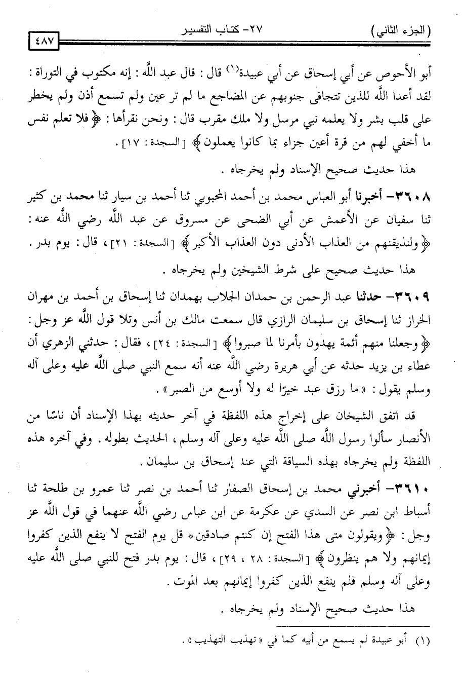 3608 - أَخْبَرَنَا أَبُو الْعَبَّاسِ مُحَمَّدُ بْنُ أَحْمَدَ الْمَحْبُوبِيُّ ، ثنا أَحْمَدُ بْنُ سَيَّارٍ ، ثنا مُحَمَّدُ بْنُ كَثِيرٍ ، ثنا سُفْيَانُ ، عَنِ الْأَعْمَشِ ، عَنْ أَبِي الضُّحَى ، عَنْ مَسْرُوقٍ ، عَنْ عَبْدِ اللَّهِ رَضِيَ اللَّهُ عَنْهُ ، { وَلَنُذِيقَنَّهُمْ مِنَ الْعَذَابِ الْأَدْنَى دُونَ الْعَذَابِ الْأَكْبَرِ } [السجدة: 21] قَالَ: " يَوْمُ بَدْرٍ "