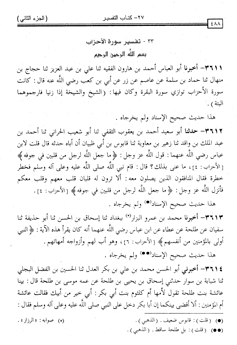 3611 - أَخْبَرَنَا أَبُو الْعَبَّاسِ أَحْمَدُ بْنُ هَارُونَ الْفَقِيهُ ، ثنا عَلِيُّ بْنُ عَبْدِ الْعَزِيزِ ، ثنا حَجَّاجُ بْنُ مِنْهَالٍ ، ثنا حَمَّادُ بْنُ سَلَمَةَ ، عَنْ عَاصِمٍ ، عَنْ زِرٍّ ، عَنْ أُبَيِّ بْنِ كَعْبٍ رَضِيَ اللَّهُ عَنْهُ ، قَالَ: " كَانَتْ سُورَةُ الْأَحْزَابِ تُوَازِي سُورَةَ الْبَقَرَةِ وَكَانَ فِيهَا: الشَّيْخُ وَالشَّيْخَةُ إِذَا زَنَيَا فَارْجُمُوهُمَا الْبَتَّةَ "