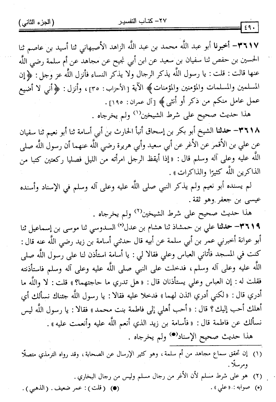 3617 - أَخْبَرَنَا أَبُو عَبْدِ اللَّهِ مُحَمَّدُ بْنُ عَبْدِ اللَّهِ الزَّاهِدُ الْأَصْبَهَانِيُّ ، ثنا أُسَيْدُ بْنُ عَاصِمٍ ، ثنا الْحُسَيْنُ بْنُ حَفْصٍ ، ثنا سُفْيَانُ بْنُ سَعِيدٍ ، عَنِ ابْنِ أَبِي نَجِيحٍ ، عَنْ مُجَاهِدٍ ، عَنْ أُمِّ سَلَمَةَ رَضِيَ اللَّهُ عَنْهَا ، قَالَتْ: قُلْتُ: يَا رَسُولَ اللَّهِ ، يُذْكَرُ الرِّجَالُ وَلَا يُذْكَرُ النِّسَاءُ . فَأَنْزَلَ اللَّهُ عَزَّ وَجَلَّ { إِنَّ الْمُسْلِمِينَ وَالْمُسْلِمَاتِ وَالْمُؤْمِنِينَ وَالْمُؤْمِنَاتِ } [الأحزاب: 35] الْآيَةُ . وَأَنْزَلَ { أَنِّي لَا أُضِيعُ عَمَلَ عَامِلٍ مِنْكُمْ مِنْ ذَكَرٍ أَوْ أُنْثَى } [آل عمران: 195] "