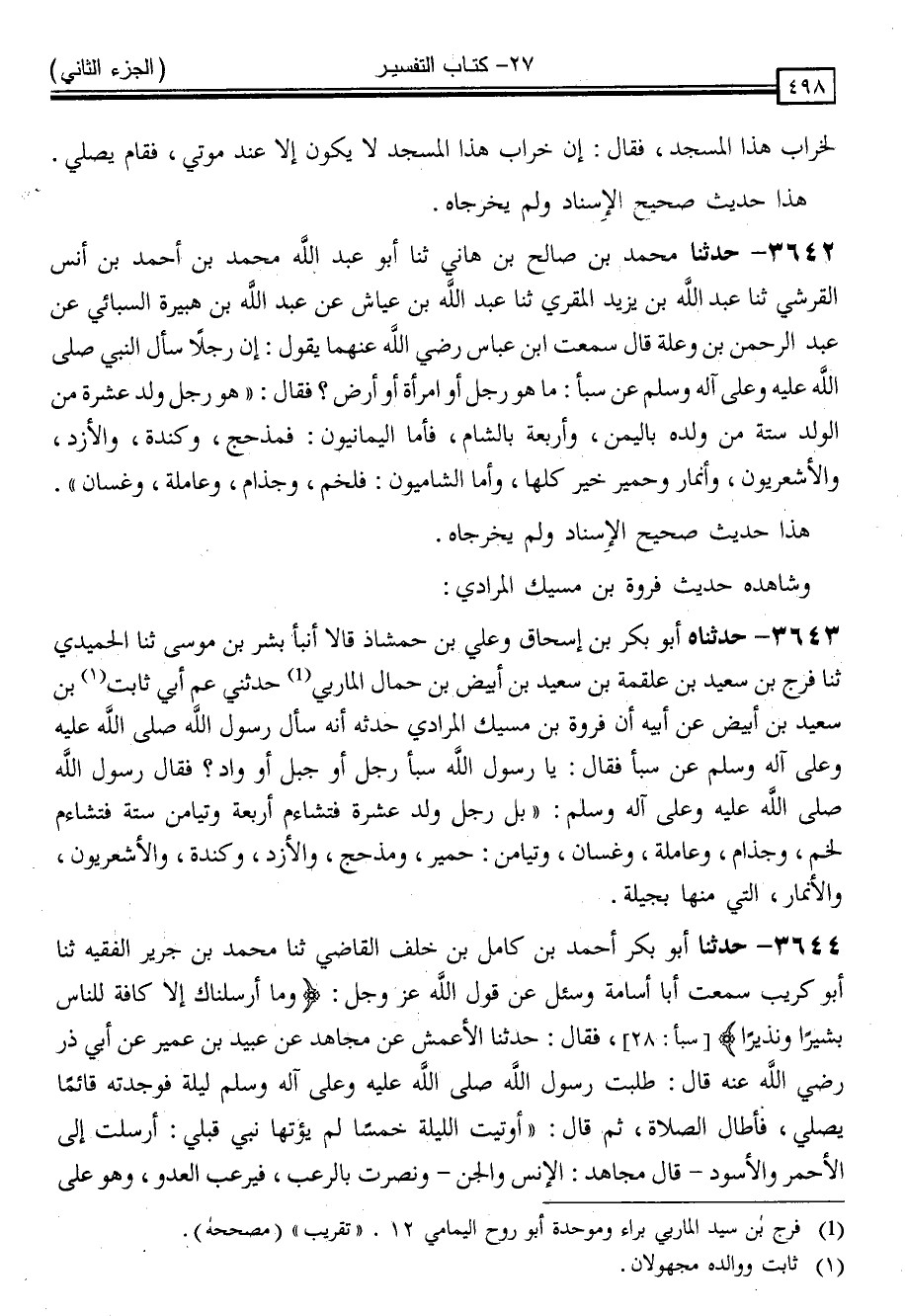 3643 - حَدَّثَنَاهُ أَبُو بَكْرِ بْنُ إِسْحَاقَ ، وَعَلِيُّ بْنُ حَمْشَاذٍ ، قَالَا: أَنْبَأَ بِشْرُ بْنُ مُوسَى ، ثنا الْحُمَيْدِيُّ ، ثنا فَرَجُ بْنُ سَعِيدِ بْنِ عَلْقَمَةَ ، عَنْ سَعِيدِ بْنِ أَبْيَضَ بْنِ حَمَّالٍ الْمَأْرِبِيُّ ، حَدَّثَنِي عَمُّ أَبِي ثَابِتِ بْنِ سَعِيدِ بْنِ أَبْيَضَ ، عَنْ أَبِيهِ فَرْوَةَ بْنِ مُسَيْكٍ الْمُرَادِيِّ ، حَدَّثَهُ أَنَّهُ سَأَلَ رَسُولَ اللَّهِ صَلَّى اللَّهُ عَلَيْهِ وَسَلَّمَ عَنْ سَبَأٍ فَقَالَ: يَا رَسُولَ اللَّهِ ، سَبَأٌ رَجُلٌ أَوْ جَبَلٌ أَمْ وَادٍ ؟ فَقَالَ رَسُولُ اللَّهِ صَلَّى اللَّهُ عَلَيْهِ وَسَلَّمَ: " بَلْ رَجُلٌ وَلَدَ عَشَرَةً فَتَشَاءَمَ أَرْبَعَةٌ وَتَيَامَنَ سِتَّةٌ فَتَشَاءَمَ لَخْمُ ، وَجُذَامُ ، وَعَامِلَةُ ، وَغَسَّانُ ، وَتَيَامَنَ حِمْيَرُ وَمَذْحِجٌ ، وَالْأَزْدُ ، وَكِنْدَةُ ، وَالْأَشْعَرِيُّونَ ، وَالْأَنْمَارُ الَّتِي مِنْهَا بَجِيلَةُ "