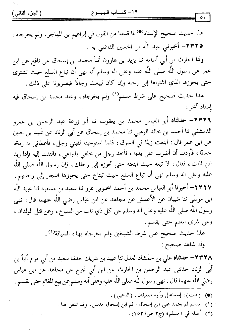 2326 - حَدَّثَنَاهُ أَبُو الْعَبَّاسِ مُحَمَّدُ بْنُ يَعْقُوبَ ، ثنا أَبُو زُرْعَةَ عَبْدُ الرَّحْمَنِ بْنُ عَمْرٍو الدِّمَشْقِيُّ ، ثنا أَحْمَدُ بْنُ خَالِدٍ الْوَهْبِيُّ ، ثنا مُحَمَّدُ بْنُ إِسْحَاقَ ، عَنْ أَبِي الزِّنَادِ ، عَنْ عُبَيْدِ بْنِ حُنَيْنٍ ، عَنِ ابْنِ عُمَرَ ، قَالَ: ابْتَعْتُ زَيْتًا فِي السُّوقِ ، فَلَمَّا اسْتَوْجَبْتُهُ ، لَقِيَنِي رَجُلٌ ، فَأَعْطَانِي بِهِ رِبْحًا حَسَنًا ، فَأَرَدْتُ أَنْ أَضْرِبَ عَلَى يَدَيْهِ ، فَأَخَذَ رَجُلٌ مِنْ خَلْفِي بِذِرَاعِي ، فَالْتَفَتُّ إِلَيْهِ ، فَإِذَا زَيْدُ بْنُ ثَابِتٍ فَقَالَ: لَا تَبِعْهُ حَيْثُ ابْتَعْتَهُ ، حَتَّى تَحُوزَهُ إِلَى رَحْلِكَ فَإِنَّ رَسُولَ اللَّهِ صَلَّى اللَّهُ عَلَيْهِ وَسَلَّمَ " نَهَى أَنْ تُبَاعَ السِّلَعُ حَيْثُ تُبْتَاعُ ، حَتَّى يَحُوزَهَا التُّجَّارُ إِلَى رِحَالِهِمْ "