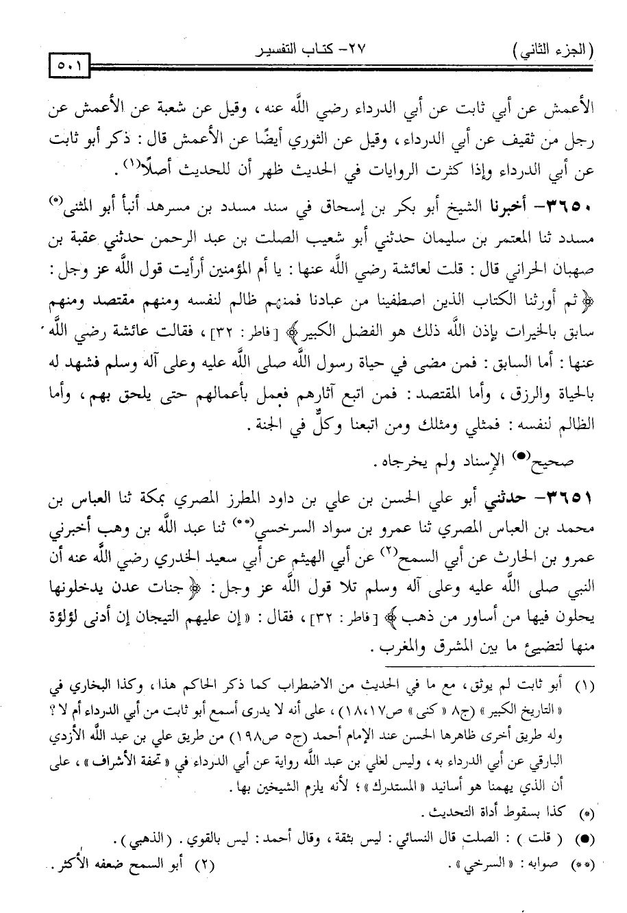 3650 - أَخْبَرَنَا الشَّيْخُ أَبُو بَكْرِ بْنُ إِسْحَاقَ ، فِي سَنَدِ مُسَدَّدِ بْنِ مُسَرْهَدٍ ، أَنْبَأَ أَبُو الْمُثَنَّى عَنْ مُسَدَّدٌ ، ثنا الْمُعْتَمِرُ بْنُ سُلَيْمَانَ ، حَدَّثَنِي أَبُو شُعَيْبٍ الصَّلْتُ بْنُ عَبْدِ الرَّحْمَنِ ، حَدَّثَنِي عُقْبَةُ بْنُ صُهْبَانَ الْحَرَّانِيُّ ، قَالَ: قُلْتُ لِعَائِشَةَ رَضِيَ اللَّهُ عَنْهَا: يَا أُمَّ الْمُؤْمِنِينَ ، أَرَأَيْتِ قَوْلَ اللَّهِ عَزَّ وَجَلَّ: { ثُمَّ أَوْرَثْنَا الْكِتَابَ الَّذِينَ اصْطَفَيْنَا مِنْ عِبَادِنَا فَمِنْهُمْ ظَالِمٌ لِنَفْسِهِ وَمِنْهُمْ مُقْتَصِدٌ وَمِنْهُمْ سَابِقٌ بِالْخَيْرَاتِ بِإِذْنِ اللَّهِ ذَلِكَ هُوَ الْفَضْلُ الْكَبِيرُ } [فاطر: 32] فَقَالَتْ عَائِشَةُ رَضِيَ اللَّهُ عَنْهَا: " أَمَّا السَّابِقُ فَمَنْ مَضَى فِي حَيَاةِ رَسُولِ اللَّهِ صَلَّى اللَّهُ عَلَيْهِ وَسَلَّمَ فَشَهِدَ لَهُ بِالْحَيَاةِ وَالرِّزْقِ ، وَأَمَّا الْمُقْتَصِدُ فَمَنِ اتَّبَعَ آثَارُهُمْ فَعَمِلَ بِأَعْمَالِهِمْ حَتَّى يَلْحَقَ بِهِمْ ، وَأَمَّا الظَّالِمُ لِنَفْسِهِ فَمِثْلِي وَمِثْلُكَ وَمَنِ اتَّبَعَنَا وَكُلٌّ فِي الْجَنَّةِ "