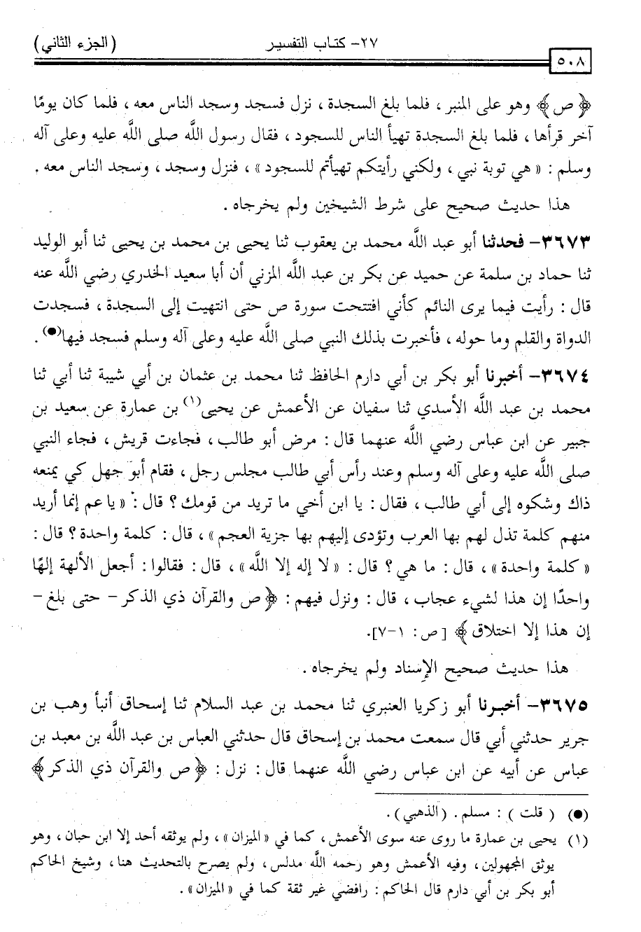 3673 - فَحَدَّثَنَا أَبُو عَبْدِ اللَّهِ مُحَمَّدُ بْنُ يَعْقُوبَ ، ثنا يَحْيَى بْنُ مُحَمَّدِ بْنِ يَحْيَى ، ثنا أَبُو الْوَلِيدِ ، ثنا حَمَّادُ بْنُ سَلَمَةَ ، عَنْ حُمَيْدٍ ، عَنْ بَكْرِ بْنِ عَبْدِ اللَّهِ الْمُزَنِيِّ ، أَنَّ أَبَا سَعِيدٍ الْخُدْرِيَّ رَضِيَ اللَّهُ عَنْهُ ، قَالَ: رَأَيْتُ فِيمَا يَرَى النَّائِمُ كَأَنِّي افْتَتَحْتُ سُورَةَ ص حَتَّى انْتَهَيْتُ إِلَى السَّجْدَةِ فَسَجَدَتِ الدَّوَاةُ وَالْقَلَمُ وَمَا حَوْلَهُ ، فَأَخْبَرْتُ بِذَلِكَ النَّبِيَّ صَلَّى اللَّهُ عَلَيْهِ وَسَلَّمَ " فَسَجَدَ فِيهَا "