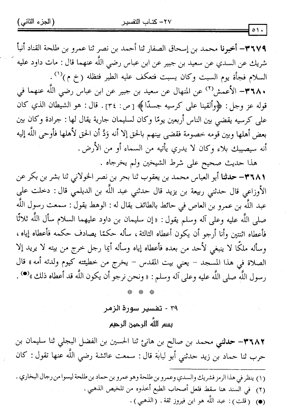 3680 - [حَدَّثَنَا أَبُو الطَّيِّبِ مُحَمَّدُ بْنُ أَحْمَدَ بْنِ الْحَسَنِ ، ثنا مُحَمَّدُ بْنُ عَبْدِ الْوَهَّابِ ، ثنا قَبِيصَةُ بْنُ عُقْبَةَ ، ثنا سُفْيَانُ ، عَنْ] الْأَعْمَشُ ، عَنِ الْمِنْهَالِ [بْنِ عَمْرٍو] ، عَنْ سَعِيدِ بْنِ جُبَيْرٍ ، عَنِ ابْنِ عَبَّاسٍ رَضِيَ اللَّهُ عَنْهُمَا ، فِي قَوْلِهِ عَزَّ وَجَلَّ: { وَأَلْقَيْنَا عَلَى كُرْسِيِّهِ جَسَدًا } [ص: 34] قَالَ: " هُوَ الشَّيْطَانُ الَّذِي كَانَ عَلَى كُرْسِيِّهِ يَقْضِي بَيْنَ النَّاسِ أَرْبَعِينَ يَوْمًا ، وَكَانَ لِسُلَيْمَانَ جَارِيَةٌ يُقَالَ لَهَا: جَرَادَةُ وَكَانَ بَيْنَ بَعْضِ أَهْلِهَا وَبَيْنَ قَوْمِهِ خُصُومَةٌ ، فَقَضَى بَيْنَهُمْ بِالْحَقِّ إِلَّا أَنَّهُ وَدَّ أَنَّ الْحَقَّ لِأَهْلِهَا ، فَأَوْحَى اللَّهُ إِلَيْهِ أَنَّهُ سَيُصِيبُكَ بَلَاءٌ ، وَكَانَ لَا يَدْرِي يَأْتِيهِ مِنَ السَّمَاءِ أَوْ مِنَ الْأَرْضِ "