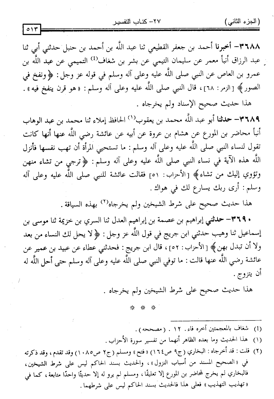 3688 - أَخْبَرَنَا أَحْمَدُ بْنُ جَعْفَرٍ الْقَطِيعِي ، ثنا عَبْدُ اللَّهِ بْنُ أَحْمَدَ بْنِ حَنْبَلٍ ، حَدَّثَنِي أَبِي ، ثنا عَبْدُ الرَّزَّاقِ ، أَنْبَأَ مَعْمَرٌ ، عَنْ سُلَيْمَانَ التَّيْمِيِّ ، عَنْ بِشْرِ بْنِ شَغَافٍ التَّمِيمِيِّ ، عَنْ عَبْدِ اللَّهِ بْنِ عَمْرِو بْنِ الْعَاصِ ، عَنِ النَّبِيِّ صَلَّى اللَّهُ عَلَيْهِ وَسَلَّمَ فِي قَوْلِهِ عَزَّ وَجَلَّ: { وَنُفِخَ فِي الصُّورِ } [الزمر: 68] قَالَ النَّبِيُّ صَلَّى اللَّهُ عَلَيْهِ وَسَلَّمَ: " هُوَ قَرْنٌ يُنْفَخُ فِيهِ "