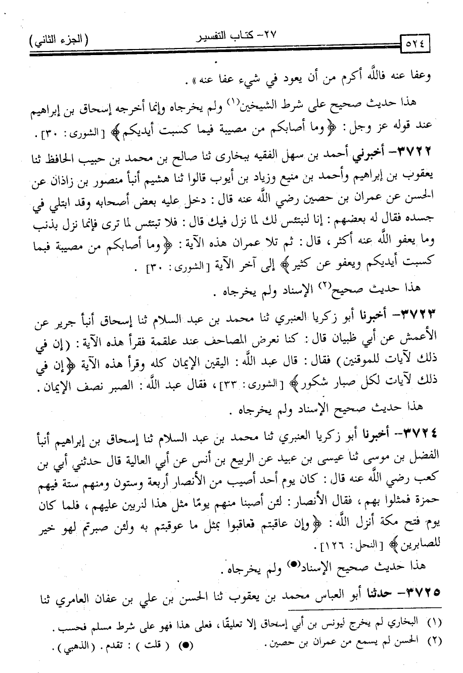 3722 - أَخْبَرَنِي أَحْمَدُ بْنُ سَهْلٍ الْفَقِيهُ ، بِبُخَارَى ، ثنا صَالِحُ بْنُ مُحَمَّدِ بْنِ حَبِيبٍ الْحَافِظُ ، ثنا يَعْقُوبُ بْنُ إِبْرَاهِيمَ ، وَأَحْمَدُ بْنُ مَنِيعٍ ، وَزِيَادُ بْنُ أَيُّوبَ ، قَالُوا: ثنا هُشَيْمٌ ، أَنْبَأَ مَنْصُورُ بْنُ زَاذَانَ ، عَنِ الْحَسَنِ ، عَنْ عِمْرَانَ بْنِ حُصَيْنٍ رَضِيَ اللَّهُ عَنْهُ ، قَالَ: دَخَلَ عَلَيْهِ بَعْضُ أَصْحَابِهِ ، وَقَدِ ابْتُلِيَ فِي جَسَدِهِ فَقَالَ لَهُ بَعْضُهُمْ: إِنَّا لَنَبْتَئِسُ لَكَ لِمَا نَزَلَ فِيكَ . قَالَ: فَلَا تَبْتَئِسْ لِمَا تَرَى ، فَإِنَّمَا نَزَلَ بِذَنْبٍ وَمَا يَعْفُو اللَّهُ عَنْهُ أَكْثَرُ ، قَالَ: " ثُمَّ تَلَا عِمْرَانُ هَذِهِ الْآيَةَ { وَمَا أَصَابَكُمْ مِنْ مُصِيبَةٍ فَبِمَا كَسَبَتْ أَيْدِيكُمْ وَيَعْفُو عَنْ كَثِيرٍ } [الشورى: 30] إِلَى آخِرِ الْآيَةِ "
