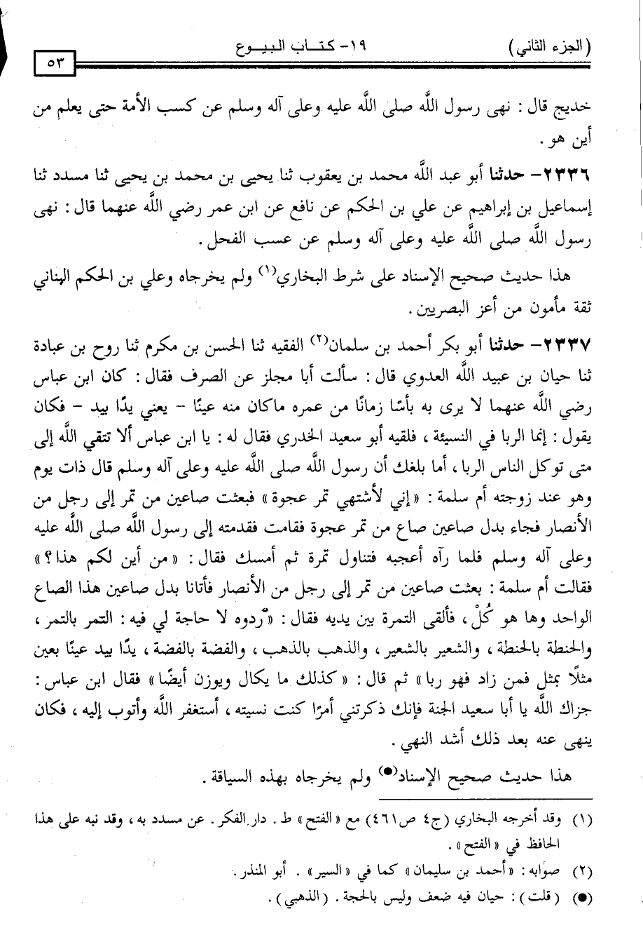 2337 - حَدَّثَنَا أَبُو بَكْرٍ أَحْمَدُ بْنُ سُلَيْمَانَ * الْفَقِيهُ ، ثنا الْحَسَنُ بْنُ مُكْرَمٍ ، ثنا رَوْحُ بْنُ عُبَادَةَ ، ثنا حَيَّانُ بْنُ عُبَيْدِ اللَّهِ الْعَدَوِيُّ ، قَالَ: سَأَلْتُ أَبَا مِجْلَزٍ عَنِ الصَّرْفِ ، فَقَالَ: كَانَ ابْنُ عَبَّاسٍ رَضِيَ اللَّهُ عَنْهُمَا ، لَا يَرَى بِهِ بَأْسًا زَمَانًا مِنْ عُمْرِهِ ، مَا كَانَ مِنْهُ عَيْنًا ، يَعْنِي يَدًا بِيَدٍ ، فَكَانَ يَقُولُ: إِنَّمَا الرِّبَا فِي النَّسِيئَةِ فَلَقِيَهُ أَبُو سَعِيدٍ الْخُدْرِيُّ فَقَالَ لَهُ: يَا ابْنَ عَبَّاسٍ أَلَا تَتَّقِي اللَّهَ ؟ إِلَى مَتَى تَوَكِّلُ النَّاسَ الرِّبَا ؟ أَمَا بَلَغَكَ أَنَّ رَسُولَ اللَّهِ صَلَّى اللَّهُ عَلَيْهِ وَسَلَّمَ قَالَ ذَاتَ يَوْمٍ وَهُوَ عِنْدَ زَوْجَتِهِ أُمِّ سَلَمَةَ: إِنِّي " لَأَشْتَهِي تَمْرَ عَجْوَةٍ ، فَبَعَثَتْ صَاعَيْنِ مِنْ تَمْرٍ إِلَى رَجُلٍ مِنَ الْأَنْصَارِ ، فَجَاءَ بَدَلَ صَاعَيْنِ صَاعٌ مِنْ تَمْرٍ عَجْوَةٍ ، فَقَامَتْ فَقَدَّمَتْهُ إِلَى رَسُولِ اللَّهِ صَلَّى اللَّهُ عَلَيْهِ وَسَلَّمَ ، فَلَمَّا رَآهُ أَعْجَبَهُ ، فَتَنَاوَلَ تَمْرَةً ، ثُمَّ أَمْسَكَ ، فَقَالَ: " مِنْ أَيْنَ لَكُمْ هَذَا ؟ " فَقَالَتْ أُمُّ سَلَمَةَ: بَعَثْتُ صَاعَيْنِ مِنْ تَمْرٍ إِلَى رَجُلٍ مِنَ الْأَنْصَارِ ، فَأَتَانَا بَدَلَ صَاعَيْنِ هَذَا الصَّاعُ الْوَاحِدُ ، وَهَا هُوَ كُلْ فَأَلْقَى التَّمْرَةَ بَيْنَ يَدَيْهِ فَقَالَ: " رُدُّوهُ لَا حَاجَةَ لِي فِيهِ التَّمْرُ بِالتَّمْرِ ، وَالْحِنْطَةُ بِالْحِنْطَةِ ، وَالشَّعِيرُ بِالشَّعِيرِ ، وَالذَّهَبُ بِالذَّهَبِ ، وَالْفِضَّةُ بِالْفِضَّةِ ، يَدًا بِيَدٍ ، عَيْنًا بِعَيْنٍ ، مِثْلًا بِمِثْلٍ ، فَمَنْ زَادَ فَهُوَ رِبًا " ثُمَّ قَالَ: " كَذَلِكَ مَا يُكَالُ وَيُوزَنُ أَيْضًا " فَقَالَ ابْنُ عَبَّاسٍ: جَزَاكَ اللَّهُ يَا أَبَا سَعِيدٍ الْجَنَّةَ ، فَإِنَّكَ ذَكَّرْتَنِي أَمْرًا كُنْتُ نَسِيتُهُ أَسْتَغْفِرُ اللَّهَ وَأَتُوبُ إِلَيْهِ . فَكَانَ يَنْهَى عَنْهُ بَعْدَ ذَلِكَ أَشَدَّ النَّهْيِ .