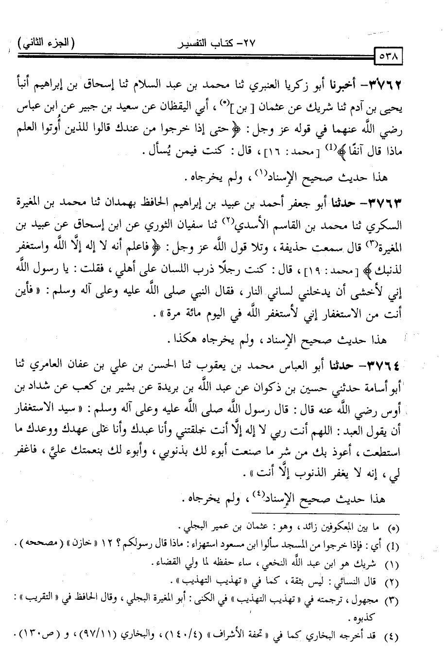 3763 - حَدَّثَنَا أَبُو جَعْفَرٍ أَحْمَدُ بْنُ عُبَيْدِ بْنِ إِبْرَاهِيمَ الْحَافِظُ بِهَمْدَانَ ، ثنا مُحَمَّدُ بْنُ الْمُغِيرَةِ السُّكَّرِيُّ ، ثنا مُحَمَّدُ بْنُ الْقَاسِمِ الْأَسَدِيُّ ، ثنا سُفْيَانُ الثَّوْرِيُّ ، عَنِ أَبِي إِسْحَاقَ ، عَنْ عُبَيْدِ بْنِ الْمُغِيرَةِ ، قَالَ: سَمِعْتُ حُذَيْفَةَ ، وَتَلَا قَوْلَ اللَّهِ عَزَّ وَجَلَّ { فَاعْلَمْ أَنَّهُ لَا إِلَهَ إِلَّا اللَّهُ وَاسْتَغْفِرْ لِذَنْبِكَ } [محمد: 19] قَالَ: كُنْتُ رَجُلًا ذَرِبَ اللِّسَانِ عَلَى أَهْلِي فَقُلْتُ: يَا رَسُولَ اللَّهِ ، إِنِّي لَأَخْشَى أَنْ يُدْخِلَنِي لِسَانِي النَّارَ . فَقَالَ النَّبِيُّ صَلَّى اللَّهُ عَلَيْهِ وَسَلَّمَ: " فَأَيْنَ أَنْتَ مِنَ الِاسْتِغْفَارِ إِنِّي لَأَسْتَغْفِرُ اللَّهَ فِي الْيَوْمِ مِائَةَ مَرَّةٍ "