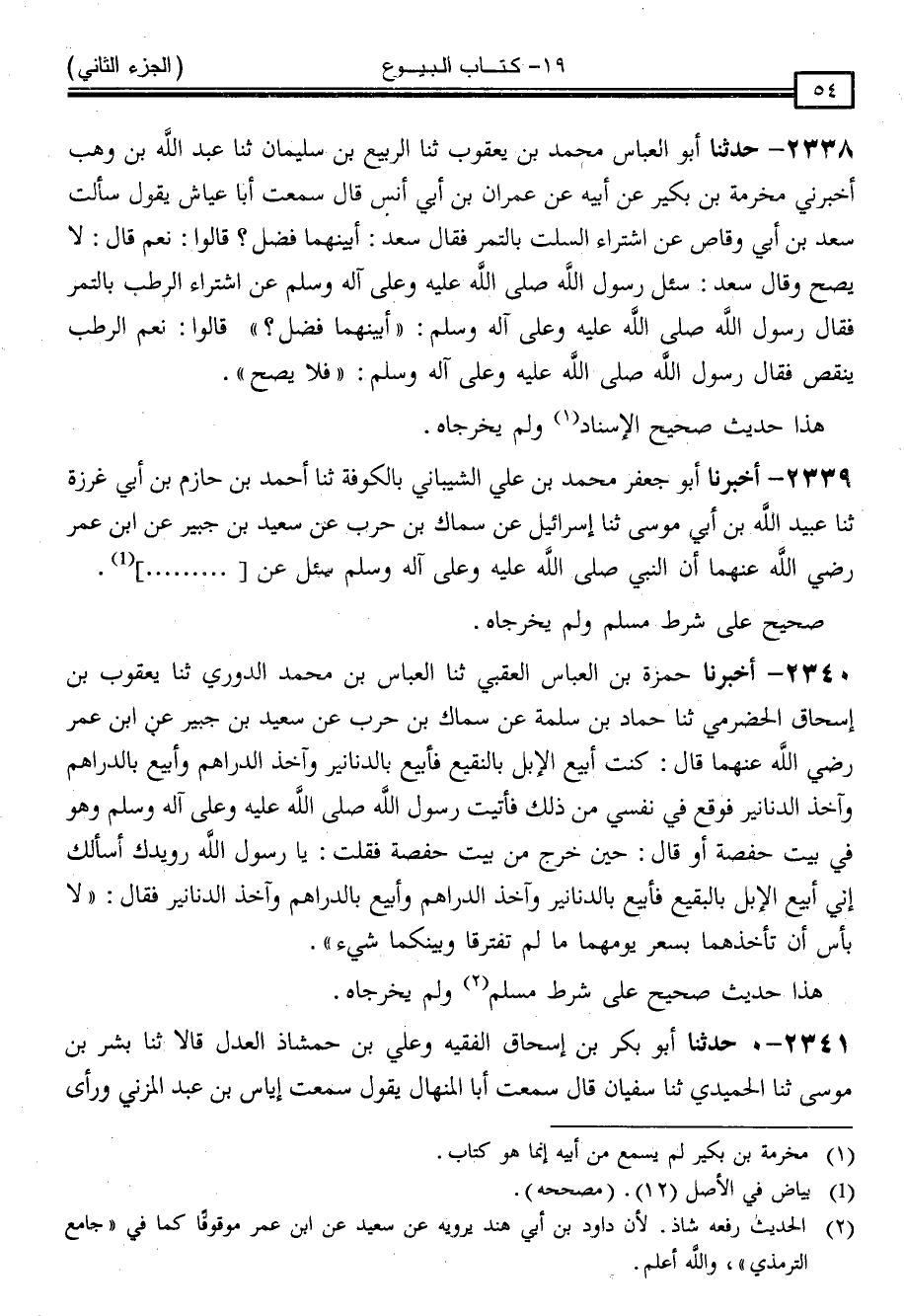 2338 - حَدَّثَنَا أَبُو الْعَبَّاسِ مُحَمَّدُ بْنُ يَعْقُوبَ ، ثنا الرَّبِيعُ بْنُ سُلَيْمَانَ ، ثنا عَبْدُ اللَّهِ بْنُ وَهْبٍ ، أَخْبَرَنِي مَخْرَمَةُ بْنُ بُكَيْرٍ ، عَنْ أَبِيهِ ، عَنْ عِمْرَانَ بْنِ أَبِي أَنَسٍ ، قَالَ: سَمِعْتُ أَبَا عَيَّاشٍ ، يَقُولُ: سَأَلْتُ سَعْدَ بْنَ أَبِي وَقَّاصٍ عَنِ اشْتِرَاءِ السُّلْتِ بِالتَّمْرِ ، فَقَالَ سَعْدٌ: أَبَيْنَهُمَا فَضْلٌ ؟ قَالُوا: نَعَمْ . قَالَ: لَا يَصِحُّ . وَقَالَ سَعْدٌ: سُئِلَ رَسُولُ اللَّهِ صَلَّى اللَّهُ عَلَيْهِ وَسَلَّمَ عَنِ اشْتِرَاءِ الرُّطَبِ بِالتَّمْرِ ، فَقَالَ رَسُولُ اللَّهِ صَلَّى اللَّهُ عَلَيْهِ وَسَلَّمَ: " أَبَيْنَهُمَا فَضْلٌ ؟ " قَالُوا: نَعَمْ ، الرُّطَبُ يَنْقُصُ . فَقَالَ رَسُولُ اللَّهِ صَلَّى اللَّهُ عَلَيْهِ وَسَلَّمَ: " فَلَا يَصِحُّ "