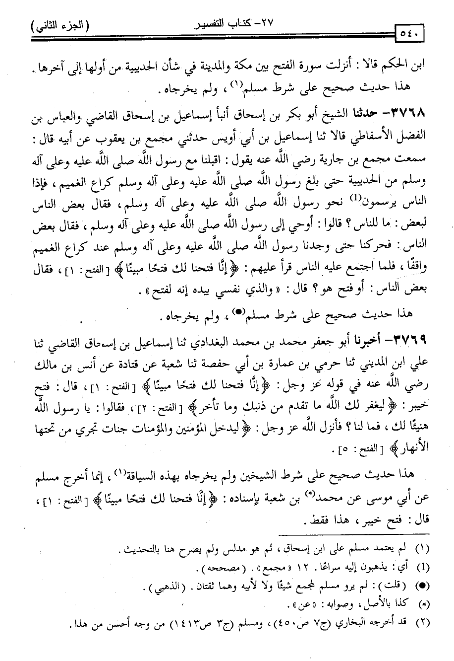 " هَذَا حَدِيثٌ صَحِيحٌ عَلَى شَرْطِ الشَّيْخَيْنِ وَلَمْ يُخَرِّجَاهُ بِهَذِهِ السِّيَاقَةِ " ، إِنَّمَا أَخْرَجَ مُسْلِمٌ عَنْ أَبِي مُوسَى ، عَنْ مُحَمَّدِ بْنِ * شُعْبَةَ بِإِسْنَادِهِ { إِنَّا فَتَحْنَا لَكَ فَتْحًا مُبِينًا } [الفتح: 1] قَالَ: فَتْحُ خَيْبَرَ . هَذَا فَقَطْ -[541]- وَقَدْ سَاقَ الْحَكَمُ بْنُ عَبْدِ الْمَلِكِ هَذَا الْحَدِيثَ عَلَى وَجْهٍ يَذْكُرُ حُنَيْنًا وَخَيْبَرَ جَمِيعًا
