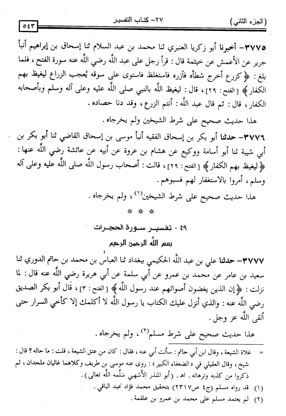 3775 - أَخْبَرَنَا أَبُو زَكَرِيَّا الْعَنْبَرِيُّ ، ثنا مُحَمَّدُ بْنُ عَبْدِ السَّلَامِ ، ثنا إِسْحَاقُ بْنُ إِبْرَاهِيمَ ، أَنْبَأَ جَرِيرٌ ، عَنِ الْأَعْمَشِ ، عَنْ خَيْثَمَةَ ، قَالَ: قَرَأَ رَجُلٌ عَلَى عَبْدِ اللَّهِ رَضِيَ اللَّهُ عَنْهُ سُورَةَ الْفَتْحِ ، فَلَمَّا بَلَغَ { كَزَرْعٍ أَخْرَجَ شَطْأَهُ ، فَآزَرَهُ فَاسْتَغْلَظَ فَاسْتَوَى عَلَى سُوقِهِ يُعْجِبُ الزُّرَّاعَ لِيَغِيظَ بِهِمُ الْكُفَّارَ } [الفتح: 29] قَالَ: " لِيَغِيظَ اللَّهُ بِالنَّبِيِّ صَلَّى اللَّهُ عَلَيْهِ وَسَلَّمَ وَبِأَصْحَابِهِ الْكُفَّارَ " قَالَ: ثُمَّ قَالَ عَبْدُ اللَّهِ: " أَنْتُمُ الزَّرْعُ وَقَدْ دَنَا حَصَادُهُ "