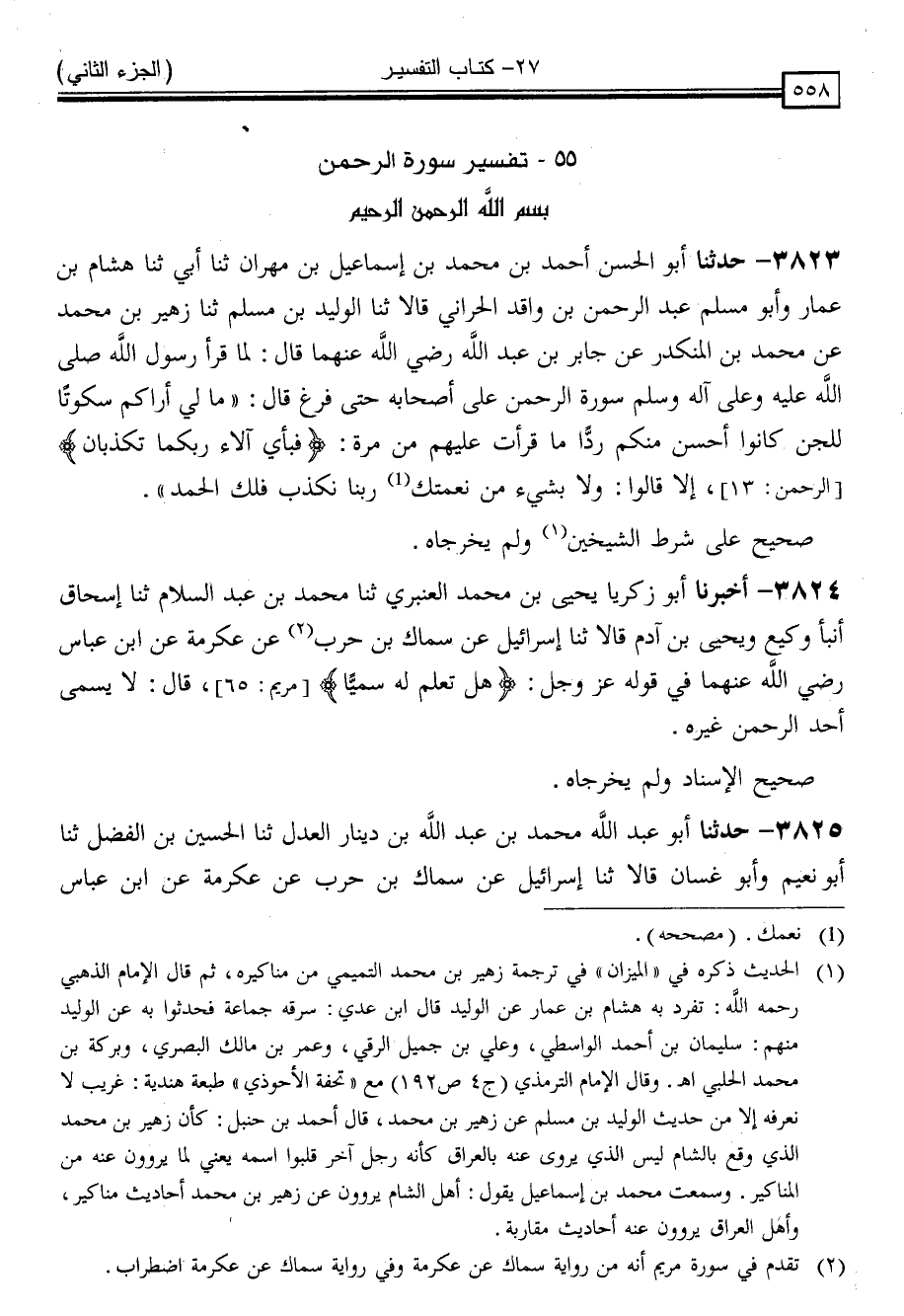 3823 - حَدَّثَنَا أَبُو الْحَسَنِ أَحْمَدُ بْنُ مُحَمَّدِ بْنِ إِسْمَاعِيلَ بْنِ مِهْرَانَ ، ثنا أَبِي ، ثنا هِشَامُ بْنُ عَمَّارٍ ، وَأَبُو مُسْلِمٍ عَبْدُ الرَّحْمَنِ بْنُ وَاقِدُ الْحَرَّانِيُّ قَالَا: ثنا الْوَلِيدُ بْنُ مُسْلِمٍ ، ثنا زُهَيْرُ بْنُ مُحَمَّدٍ ، عَنْ مُحَمَّدِ بْنِ الْمُنْكَدِرِ ، عَنْ جَابِرِ بْنِ عَبْدِ اللَّهِ رَضِيَ اللَّهُ عَنْهُمَا ، قَالَ: لَمَّا قَرَأَ رَسُولُ اللَّهِ صَلَّى اللَّهُ عَلَيْهِ وَسَلَّمَ سُورَةَ الرَّحْمَنِ عَلَى أَصْحَابِهِ حَتَّى فَرَغَ قَالَ: " مَا لِي أَرَاكُمْ سُكُوتًا لَلْجِنُّ كَانُوا أَحْسَنَ مِنْكُمْ رَدًّا ، مَا قَرَأْتُ عَلَيْهِمْ مِنْ مَرَّةٍ ، { فَبِأَيِّ آلَاءِ رَبِّكُمَا تُكَذِّبَانِ } [الرحمن: 13] إِلَّا قَالُوا: وَلَا بِشَيْءٍ مِنْ نِعْمَتِكَ رَبَّنَا نُكَذِّبُ فَلَكَ الْحَمْدُ "