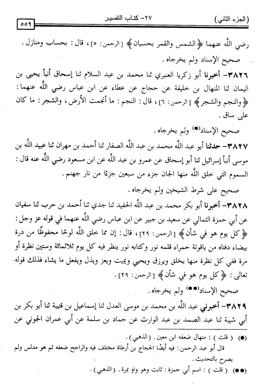 3826 - أَخْبَرَنَا أَبُو زَكَرِيَّا الْعَنْبَرِيُّ ، ثنا مُحَمَّدُ بْنُ عَبْدِ السَّلَامِ ، ثنا إِسْحَاقُ ، أَنْبَأَ يَحْيَى بْنُ الْيَمَانِ ، ثنا الْمِنْهَالُ بْنُ خَلِيفَةَ ، عَنْ حَجَّاجٍ ، عَنْ عَطَاءٍ ، عَنِ ابْنِ عَبَّاسٍ رَضِيَ اللَّهُ عَنْهُمَا ، { وَالنَّجْمُ وَالشَّجَرُ } [الرحمن: 6] قَالَ: " النَّجْمُ مَا أَنْجَمَتِ الْأَرْضُ وَالشَّجَرُ مَا كَانَ عَلَى سَاقٍ "
