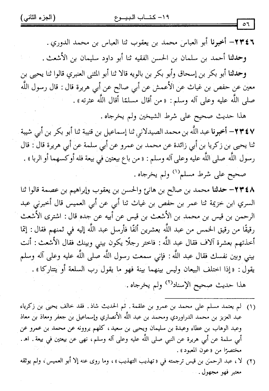 2346 - أَخْبَرَنَا أَبُو الْعَبَّاسِ مُحَمَّدُ بْنُ يَعْقُوبَ ، ثنا الْعَبَّاسُ بْنُ مُحَمَّدٍ الدُّورِيُّ ، وَحَدَّثَنَا أَحْمَدُ بْنُ سَلْمَانَ بْنِ الْحَسَنِ الْفَقِيهُ ، ثنا أَبُو دَاوُدَ سُلَيْمَانُ بْنُ الْأَشْعَثِ ، وَحَدَّثَنَا أَبُو بَكْرِ بْنُ إِسْحَاقَ ، وَأَبُو بَكْرِ بْنُ بَالَوَيْهِ قَالَا: ثنا أَبُو الْمُثَنَّى الْعَنْبَرِيُّ ، قَالُوا ثنا يَحْيَى بْنُ مَعِينٍ ، عَنْ حَفْصِ بْنِ غِيَاثٍ ، عَنِ الْأَعْمَشِ ، عَنْ أَبِي صَالِحٍ ، عَنْ أَبِي هُرَيْرَةَ ، قَالَ: قَالَ رَسُولُ اللَّهِ صَلَّى اللَّهُ عَلَيْهِ وَسَلَّمَ: " مِنْ أَقَالَ مُسْلِمًا ، أَقَالَ اللَّهُ عَثْرَتَهُ "