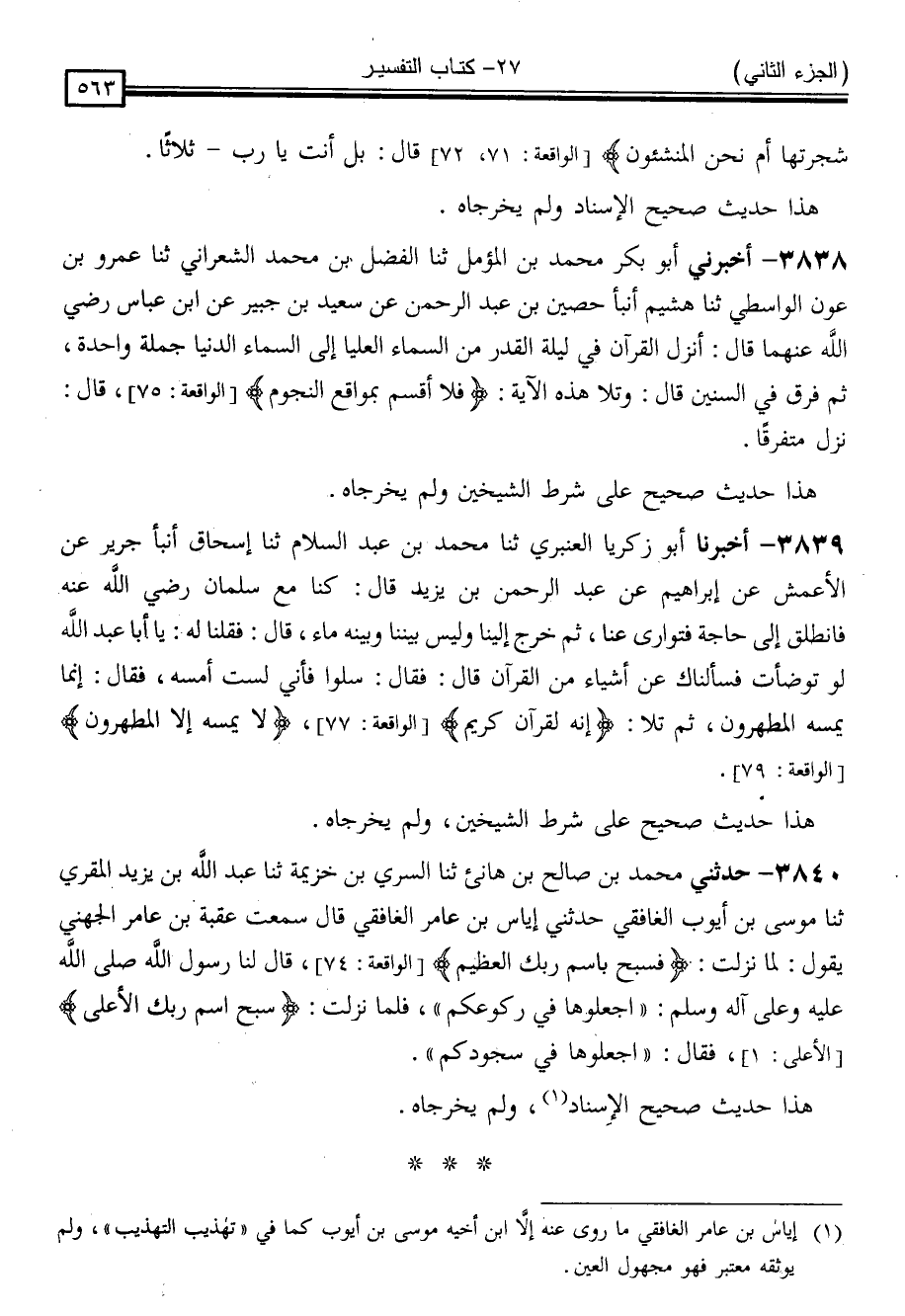 3838 - أَخْبَرَنِي أَبُو بَكْرٍ مُحَمَّدُ بْنُ الْمُؤَمَّلِ ، ثنا الْفَضْلُ بْنُ مُحَمَّدٍ الشَّعْرَانِيُّ ، ثنا عَمْرُو بْنُ عَوْنٍ الْوَاسِطِيُّ ، ثنا هُشَيْمٌ ، أَنْبَأَ حُصَيْنُ بْنُ عَبْدِ الرَّحْمَنِ ، عَنْ سَعِيدِ بْنِ جُبَيْرٍ ، عَنِ ابْنِ عَبَّاسٍ رَضِيَ اللَّهُ عَنْهُمَا ، قَالَ: " أُنْزِلَ الْقُرْآنُ فِي لَيْلَةِ الْقَدْرِ مِنَ السَّمَاءِ الْعُلْيَا إِلَى السَّمَاءِ الدُّنْيَا جُمْلَةً وَاحِدَةً ، ثُمَّ فُرِقَ فِي السِّنِينَ قَالَ: وَتَلَا هَذِهِ الْآيَةَ { فَلَا أُقْسِمُ بِمَوَاقِعِ النُّجُومِ } [الواقعة: 75] قَالَ: " نَزَلَ مُتَفَرِّقًا "