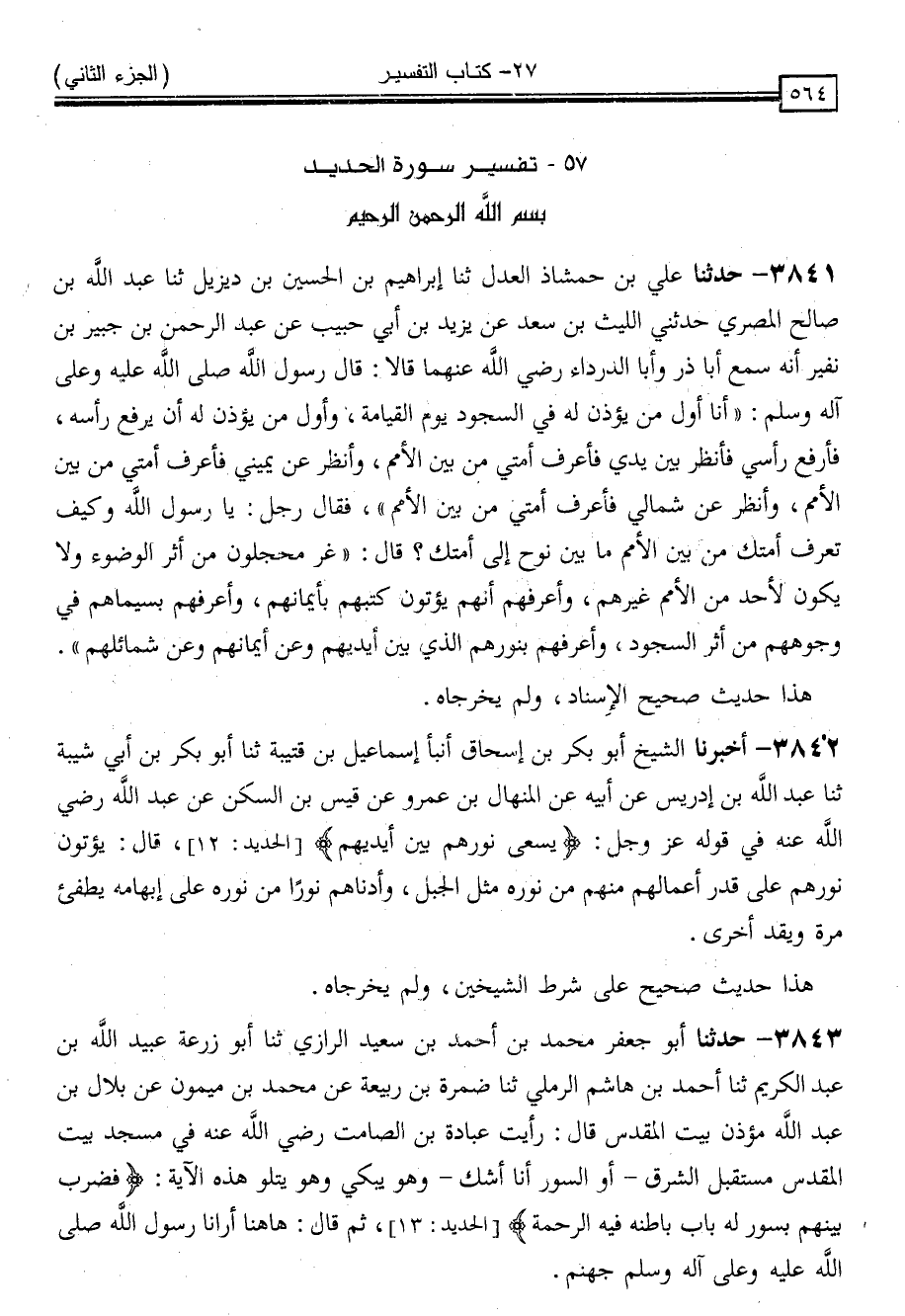 3843 - حَدَّثَنَا أَبُو جَعْفَرٍ مُحَمَّدُ بْنُ أَحْمَدَ بْنِ سَعِيدٍ الرَّازِيُّ ، ثنا أَبُو زُرْعَةَ عُبَيْدُ اللَّهِ بْنُ عَبْدِ الْكَرِيمِ ، ثنا أَحْمَدُ بْنُ هَاشِمٍ الرَّمْلِيُّ ، ثنا ضَمْرَةُ بْنُ رَبِيعَةَ ، عَنْ مُحَمَّدِ بْنِ مَيْمُونٍ ، عَنْ بِلَالِ بْنِ عَبْدِ اللَّهِ مُؤَذِّنِ بَيْتِ الْمَقْدِسِ ، قَالَ: " رَأَيْتُ عُبَادَةَ بْنَ الصَّامِتِ رَضِيَ اللَّهُ عَنْهُ ، فِي مَسْجِدِ بَيْتِ الْمَقْدِسِ مُسْتَقْبِلَ الشَّرْقَ أَوِ السُّوَرَ ، أَنَا أَشُكُّ ، وَهُوَ يَبْكِي وَهُوَ يَتْلُو هَذِهِ الْآيَةَ { فَضُرِبَ بَيْنَهُمْ ، بِسُوَرٍ لَهُ بَابٌ بَاطِنُهُ فِيهِ الرَّحْمَةُ } [الحديد: 13] ، ثُمَّ قَالَ: هَا هُنَا أُرَانَا رَسُولُ اللَّهِ صَلَّى اللَّهُ عَلَيْهِ وَسَلَّمَ جَهَنَّمَ " -[565]-