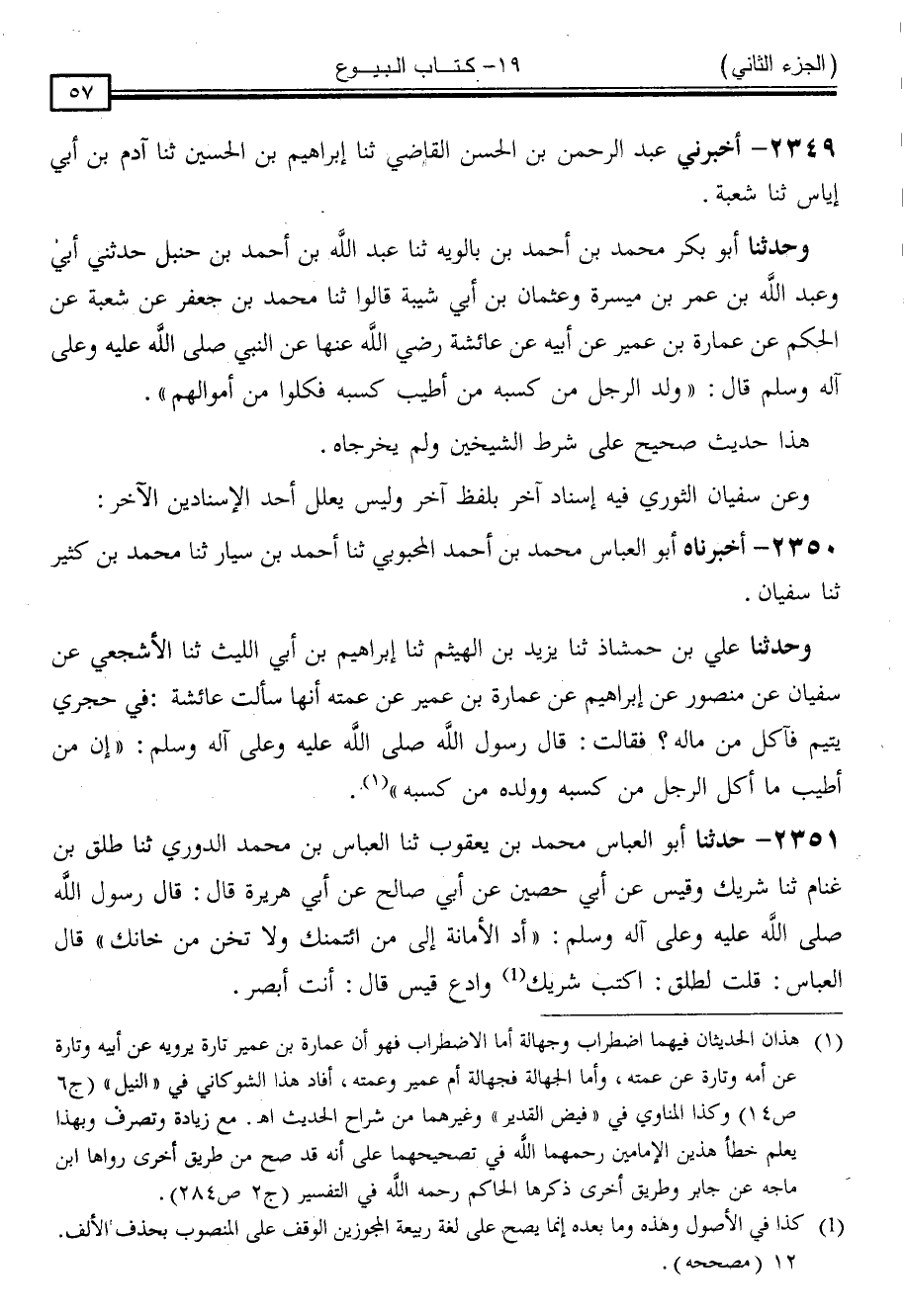 2350 - أَخْبَرَنَاهُ أَبُو الْعَبَّاسِ مُحَمَّدُ بْنُ أَحْمَدَ الْمَحْبُوبِيُّ ، ثنا أَحْمَدُ بْنُ سَيَّارٍ ، ثنا مُحَمَّدُ بْنُ كَثِيرٍ ، ثنا سُفْيَانُ ، وَحَدَّثَنَا عَلِيُّ بْنُ حَمْشَاذٍ ، ثنا يَزِيدُ بْنُ الْهَيْثَمِ ، ثنا إِبْرَاهِيمُ بْنُ أَبِي اللَّيْثِ ، ثنا الْأَشْجَعِيُّ ، عَنْ سُفْيَانَ ، عَنْ مَنْصُورٍ ، عَنْ إِبْرَاهِيمَ ، عَنْ عُمَارَةَ بْنِ عُمَيْرٍ ، عَنْ عَمَّتِهِ ، أَنَّهَا سَأَلَتْ عَائِشَةَ: فِي حِجْرِي يَتِيمٌ فَآكُلُ مِنْ مَالِهِ ؟ فَقَالَتْ: قَالَ رَسُولُ اللَّهِ صَلَّى اللَّهُ عَلَيْهِ وَسَلَّمَ: " إِنَّ مِنْ أَطْيَبِ مَا أَكَلَ الرَّجُلُ مِنْ كَسْبِهِ ، وَوَلَدُهُ مِنْ كَسْبِهِ "