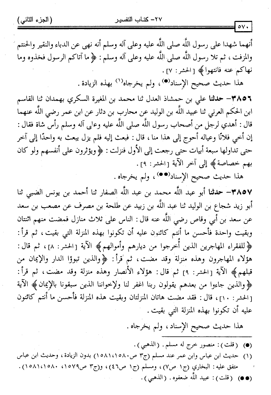 3857 - حَدَّثَنَا أَبُو عَبْدِ اللَّهِ مُحَمَّدُ بْنُ عَبْدِ اللَّهِ الصَّفَّارُ ، ثنا أَحْمَدُ بْنُ يُونُسَ الضَّبِّيُّ ، ثنا أَبُو بَدْرٍ شُجَاعُ بْنُ الْوَلِيدِ ، ثنا عَبْدُ اللَّهِ بْنُ زُبَيْدٍ ، عَنْ طَلْحَةَ بْنِ مُصَرِّفٍ ، عَنْ مُصْعَبِ بْنِ سَعْدٍ ، عَنْ سَعْدِ بْنِ أَبِي وَقَّاصٍ رَضِيَ اللَّهُ عَنْهُ ، قَالَ: " النَّاسُ عَلَى ثَلَاثِ مَنَازِلَ فَمَضَتْ مِنْهُمُ اثْنَتَانِ وَبَقِيَتْ وَاحِدَةٌ ، فَأَحْسَنُ مَا أَنْتُمْ كَائِنُونَ عَلَيْهِ أَنْ تَكُونُوا بِهَذِهِ الْمَنْزِلَةِ الَّتِي بَقِيَتْ ، ثُمَّ قَرَأَ { لِلْفُقَرَاءِ الْمُهَاجِرِينَ الَّذِينَ أُخْرِجُوا مِنْ دِيَارِهِمْ وَأَمْوَالِهِمْ } [الحشر: 8] الْآيَةَ ، ثُمَّ قَالَ: هَؤُلَاءِ الْمُهَاجِرُونَ وَهَذِهِ مَنْزِلَةٌ وَقَدْ مَضَتْ ، ثُمَّ قَرَأَ { وَالَّذِينَ تَبَوَّءُوا الدَّارَ وَالْإِيمَانَ مِنْ قَبْلِهِمْ } الْآيَةَ ، ثُمَّ قَالَ: هَؤُلَاءِ الْأَنْصَارُ وَهَذِهِ مَنْزِلَةٌ وَقَدْ مَضَتْ ، ثُمَّ قَرَأَ { وَالَّذِينَ جَاءُوا مِنْ بَعْدِهِمْ يَقُولُونَ رَبَّنَا اغْفِرْ لَنَا وَلِإِخْوَانِنَا الَّذِينَ سَبَقُونَا بِالْإِيمَانِ } الْآيَةَ ، قَالَ: فَقَدْ مَضَتْ هَاتَانِ الْمَنْزِلَتَانِ وَبَقِيَتْ هَذِهِ الْمَنْزِلَةُ فَأَحْسَنُ مَا أَنْتُمْ كَائِنُونَ عَلَيْهِ أَنْ تَكُونُوا بِهَذِهِ الْمَنْزِلَةِ الَّتِي بَقِيَتْ "