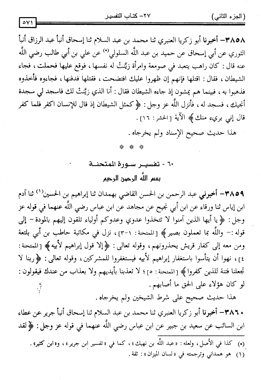 3859 - أَخْبَرَنِي عَبْدُ الرَّحْمَنِ بْنُ الْحَسَنِ الْقَاضِي ، بِهَمْدَانَ ، ثنا إِبْرَاهِيمُ بْنُ الْحُسَيْنِ ، ثنا آدَمُ بْنُ أَبِي إِيَاسٍ ، ثنا وَرْقَاءُ ، عَنِ ابْنِ أَبِي نَجِيحٍ ، عَنْ مُجَاهِدٍ ، عَنِ ابْنِ عَبَّاسٍ رَضِيَ اللَّهُ عَنْهُمَا ، فِي قَوْلِهِ عَزَّ وَجَلَّ: { يَا أَيُّهَا الَّذِينَ آمَنُوا لَا تَتَّخِذُوا عَدُوِّي وَعَدُوَّكُمْ أَوْلِيَاءَ تُلْقُونَ إِلَيْهِمْ بِالْمَوَدَّةِ } [الممتحنة: 1] إِلَى قَوْلِهِ { وَاللَّهُ بِمَا تَعْمَلُونَ بَصِيرٌ } [الممتحنة: 3] نَزَلَ فِي مُكَاتَبَةِ حَاطِبِ بْنِ أَبِي بَلْتَعَةَ وَمَنْ مَعَهُ إِلَى كُفَّارِ قُرَيْشٍ يُحَذِّرُونَهُمْ ، وَقَوْلُهُ تَعَالَى: { إِلَّا قَوْلَ إِبْرَاهِيمَ لِأَبِيهِ } [الممتحنة: 4] نُهُوا أَنْ يَتَأَسَّوْا بِاسْتِغْفَارِ إِبْرَاهِيمَ لِأَبِيهِ فَيَسْتَغْفِرُوا لِلْمُشْرِكِينَ وَقَوْلُهُ تَعَالَى { رَبَّنَا لَا تَجْعَلْنَا فِتْنَةً لِلَّذِينَ كَفَرُوا } [الممتحنة: 5] لَا تُعَذِّبْنَا بِأَيْدِيهِمْ وَلَا بِعَذَابٍ مِنْ عِنْدِكِ فَيَقُولُونَ لَوْ كَانَ هَؤُلَاءِ عَلَى الْحَقِّ مَا أَصَابَهُمْ "