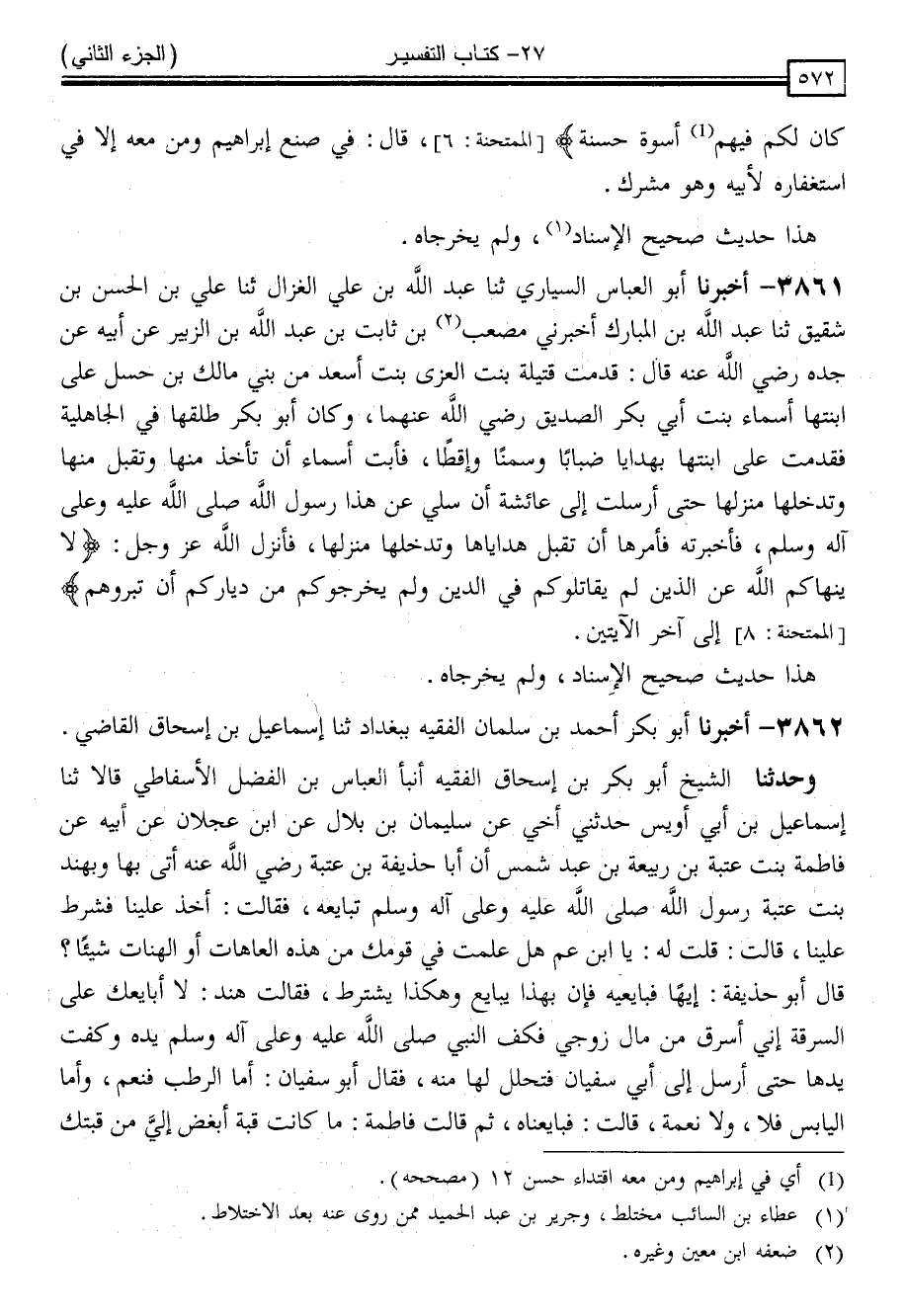 3861 - أَخْبَرَنَا أَبُو الْعَبَّاسِ السَّيَّارِيُّ ، ثنا عَبْدُ اللَّهِ بْنُ عَلِيِّ الْغَزَّالُ ، ثنا عَلِيُّ بْنُ الْحَسَنِ بْنِ شَقِيقٍ ، ثنا عَبْدُ اللَّهِ بْنُ الْمُبَارَكِ ، أَخْبَرَنِي مُصْعَبُ بْنُ ثَابِتِ بْنِ عَبْدِ اللَّهِ بْنِ الزُّبَيْرِ ، عَنْ أَبِيهِ ، عَنْ جَدِّهِ رَضِيَ اللَّهُ عَنْهُ ، قَالَ: قَدِمَتْ قُتَيْلَةُ بِنْتُ الْعُزَّى بِنْتِ أَسْعَدَ مِنْ بَنِي مَالِكِ بْنِ حَسَلٍ عَلَى ابْنَتِهَا أَسْمَاءَ بِنْتِ أَبِي بَكْرٍ الصِّدِّيقِ رَضِيَ اللَّهُ عَنْهُمَا ، وَكَانَ أَبُو بَكْرٍ طَلَّقَهَا فِي الْجَاهِلِيَّةِ ، فَقَدِمَتْ عَلَى ابْنَتِهَا بِهَدَايَا ضِبَابًا وَسَمْنًا وَأَقِطًا ، فَأَبَتْ أَسْمَاءُ أَنْ تَأْخُذَ مِنْهَا ، وَتَقْبَلَ مِنْهَا وَتُدْخِلَهَا مَنْزِلَهَا حَتَّى أَرْسَلَتْ إِلَى عَائِشَةَ أَنْ سَلِي عَنْ هَذَا رَسُولَ اللَّهِ صَلَّى اللَّهُ عَلَيْهِ وَسَلَّمَ ، فَأَخْبَرَتْهُ " فَأَمَرَهَا أَنْ تَقْبَلَ هَدَايَاهَا وَتُدْخِلَهَا مَنْزِلَهَا " فَأَنْزَلَ اللَّهُ عَزَّ وَجَلَّ { لَا يَنْهَاكُمُ اللَّهُ عَنِ الَّذِينَ لَمْ يُقَاتِلُوكُمْ فِي الدِّينِ وَلَمْ يُخْرِجُوكُمْ مِنْ دِيَارِكُمْ أَنْ تَبَرُّوهُمْ } [الممتحنة: 8] إِلَى آخِرِ الْآيَتَيْنِ