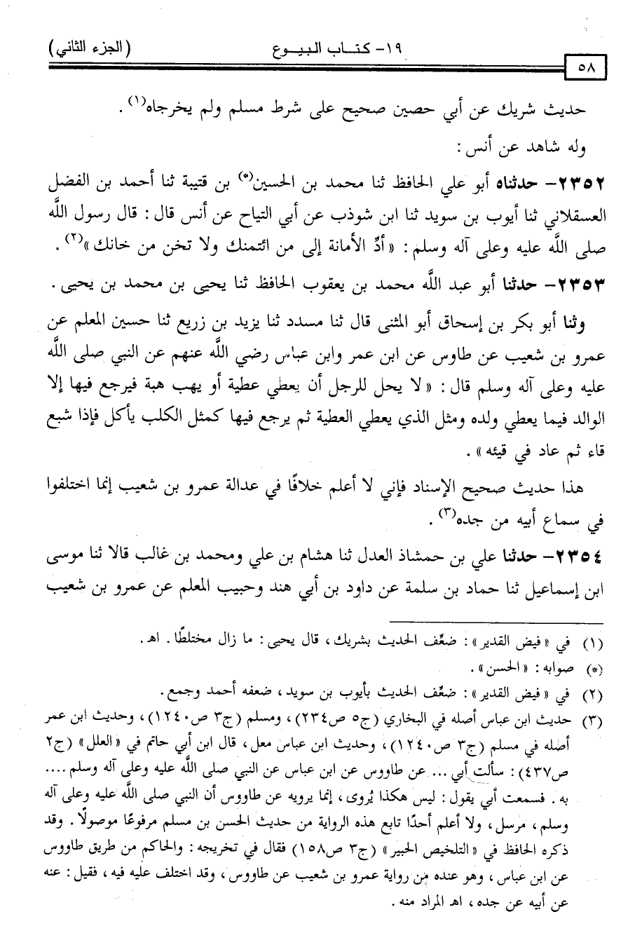2353 - حَدَّثَنَا أَبُو عَبْدِ اللَّهِ مُحَمَّدُ بْنُ يَعْقُوبَ الْحَافِظُ ، ثنا يَحْيَى بْنُ مُحَمَّدِ بْنِ يَحْيَى ، وَحَدَّثَنَا أَبُو بَكْرِ بْنُ إِسْحَاقَ أَبُو الْمُثَنَّى ، قَالَ: ثنا مُسَدَّدٌ ، ثنا يَزِيدُ بْنُ زُرَيْعٍ ، ثنا حُسَيْنٌ الْمُعَلِّمُ ، عَنْ عَمْرِو بْنِ شُعَيْبٍ ، عَنْ طَاوُسٍ ، عَنِ ابْنِ عُمَرَ ، وَابْنِ عَبَّاسٍ رَضِيَ اللَّهُ عَنْهُمْ ، عَنِ النَّبِيِّ صَلَّى اللَّهُ عَلَيْهِ وَسَلَّمَ قَالَ: " لَا يَحِلُّ لِلرَّجُلِ أَنْ يُعْطِيَ عَطِيَّةً ، أَوْ يَهَبَ هِبَةً ، فَيَرْجِعَ فِيهَا إِلَّا الْوَالِدُ ، فِيمَا يُعْطِي وَلَدَهُ ، وَمَثَلُ الَّذِي يُعْطِي الْعَطِيَّةَ ، ثُمَّ يَرْجِعُ فِيهَا ، كَمَثَلِ الْكَلْبِ يَأْكُلُ ، فَإِذَا شَبِعَ ، قَاءَ ، ثُمَّ عَادَ فِي قَيْئِهِ "