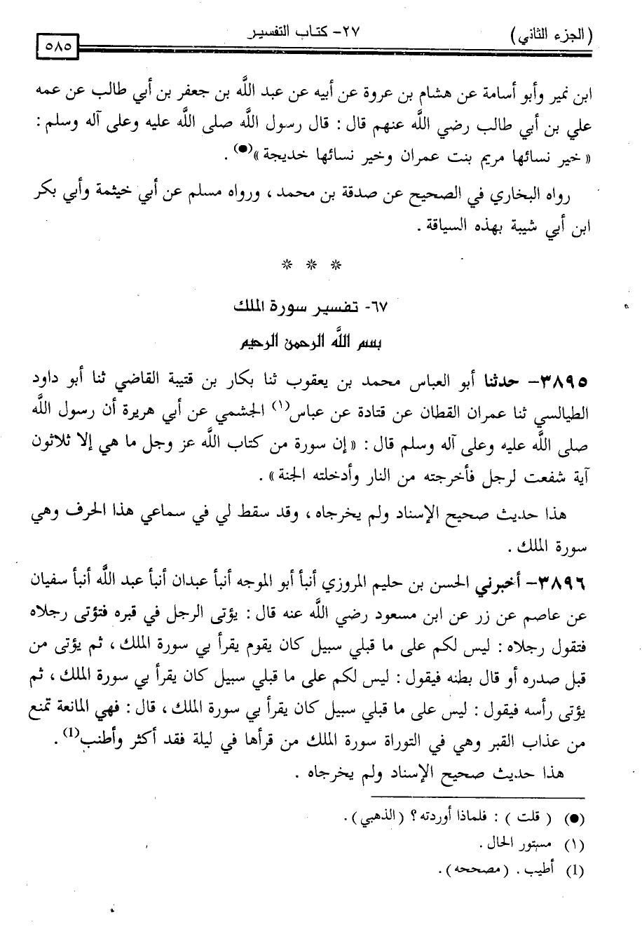 " هَذَا حَدِيثٌ صَحِيحُ الْإِسْنَادِ وَلَمْ يُخَرِّجَاهُ ، وَقَدْ سَقَطَ لِي فِي سَمَاعِي هَذَا الْحَرْفُ وَهِيَ سُورَةُ الْمُلْكِ "