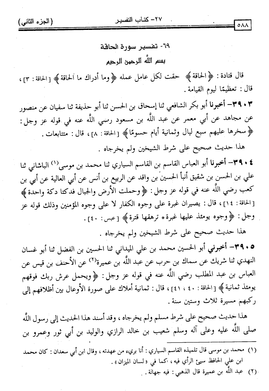 3903 - أَخْبَرَنَا أَبُو بَكْرٍ الشَّافِعِيُّ ، ثنا إِسْحَاقُ بْنُ الْحَسَنِ ، ثنا أَبُو حُذَيْفَةَ ، ثنا سُفْيَانُ ، عَنْ مَنْصُورٍ ، عَنْ مُجَاهِدٍ ، عَنْ أَبِي مَعْمَرٍ ، عَنْ عَبْدِ اللَّهِ بْنِ مَسْعُودٍ رَضِيَ اللَّهُ عَنْهُ ، فِي قَوْلِهِ عَزَّ وَجَلَّ: { سَخَّرَهَا عَلَيْهِمْ سَبْعَ لَيَالٍ وَثَمَانِيَةَ أَيَّامٍ حُسُومًا } [الحاقة: 7] . قَالَ: " مُتَتَابِعَاتٍ "