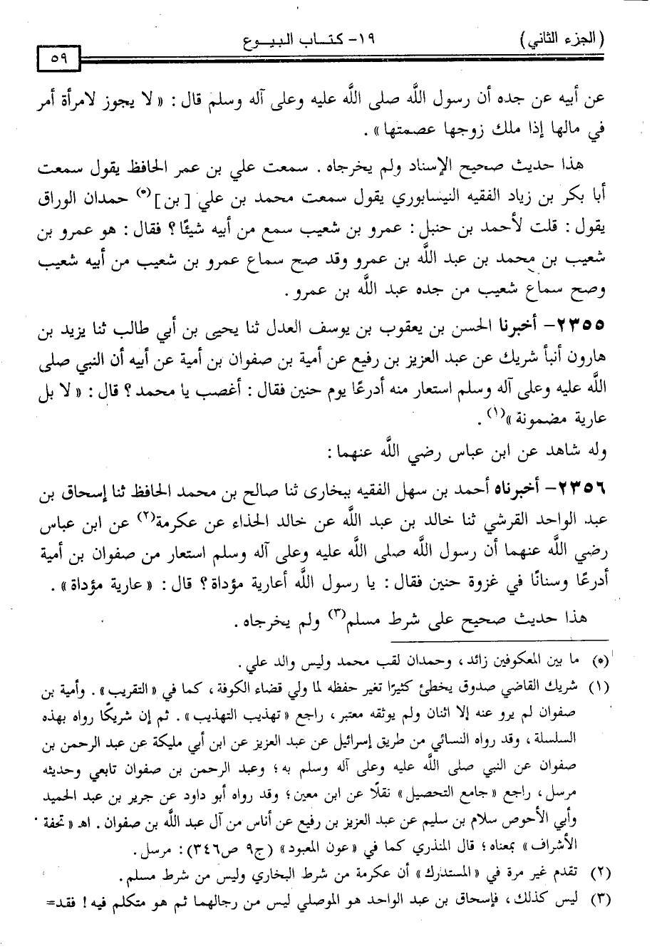 2356 - أَخْبَرَنَاهُ أَحْمَدُ بْنُ سَهْلٍ الْفَقِيهُ ، بِبُخَارَى ، ثنا صَالِحُ بْنُ مُحَمَّدٍ الْحَافِظُ ، ثنا إِسْحَاقُ بْنُ عَبْدِ الْوَاحِدِ الْقُرَشِيُّ ، ثنا خَالِدُ بْنُ عَبْدِ اللَّهِ ، عَنْ خَالِدٍ الْحَذَّاءِ ، عَنْ عِكْرِمَةَ ، عَنِ ابْنِ عَبَّاسٍ رَضِيَ اللَّهُ عَنْهُمَا ، أَنَّ رَسُولَ اللَّهِ صَلَّى اللَّهُ عَلَيْهِ وَسَلَّمَ اسْتَعَارَ مِنْ صَفْوَانَ بْنِ أُمَيَّةَ أَدْرُعًا وَسِنَانًا فِي غَزْوَةِ حُنَيْنٍ فَقَالَ: يَا رَسُولَ اللَّهِ ، أَعَارِيَةٌ مُؤَدَّاةٌ ؟ قَالَ: " عَارِيَةٌ مُؤَدَّاةٌ "
